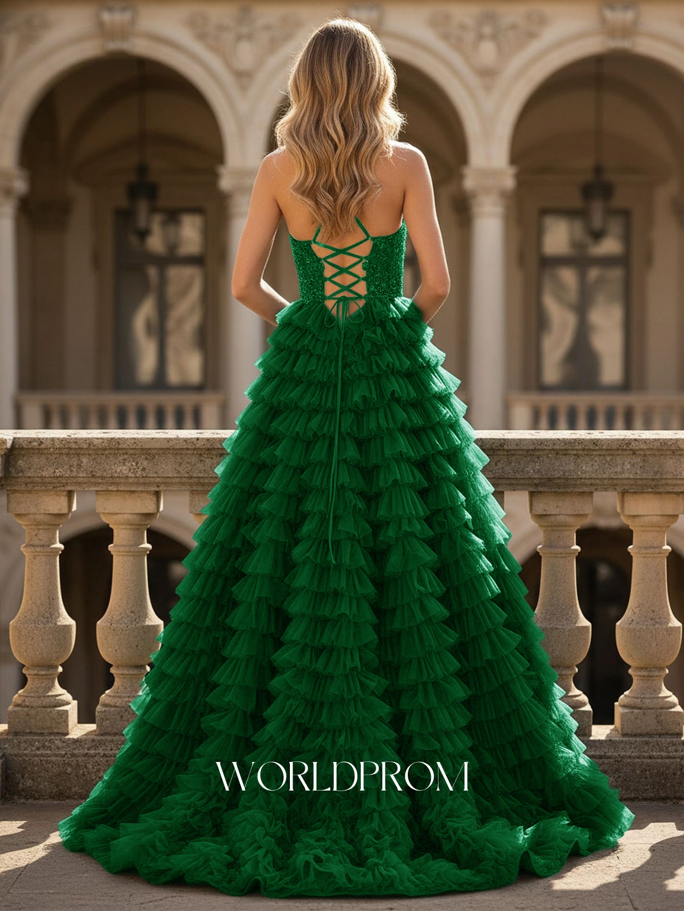 This tulle prom dress features embroidery lace up and criss cross back on the bodice. The spaghetti straps dress for prom has a v-neck and layered ruffle hem. This ball gown prom dress is ideal for party, evening, anniversary party, birthday party, cocktail, graduation party or homecoming events.
