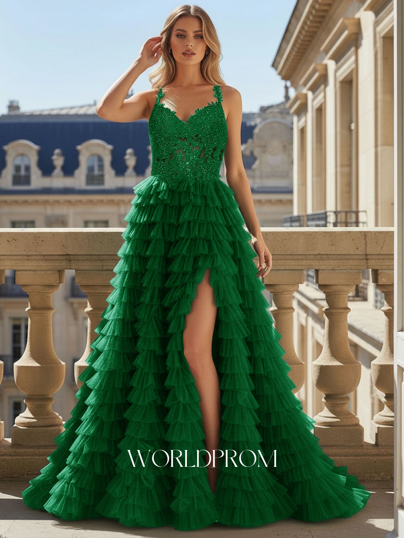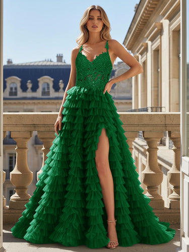 Sparkly Bodice Spaghetti Strap Layered Slit Ball Gown Prom Dress - Emerald Green
