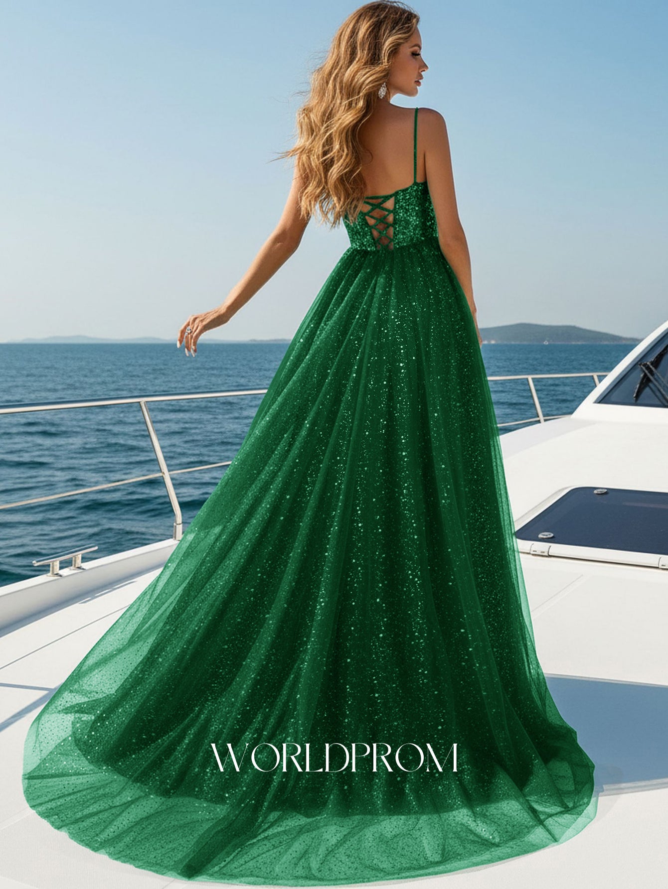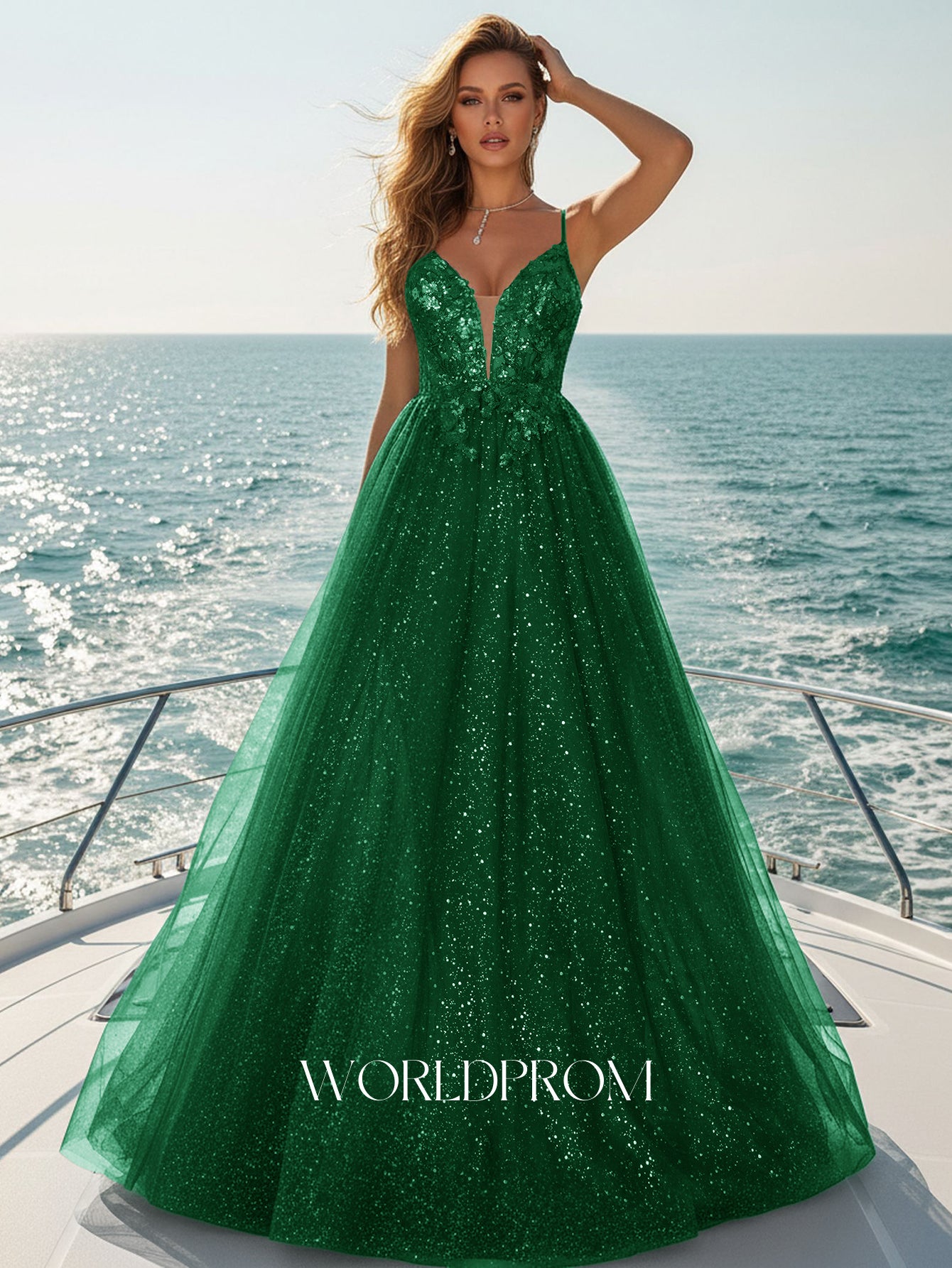 Sparkly Lace Deep V Neck Long Prom Dress - Emerald Green