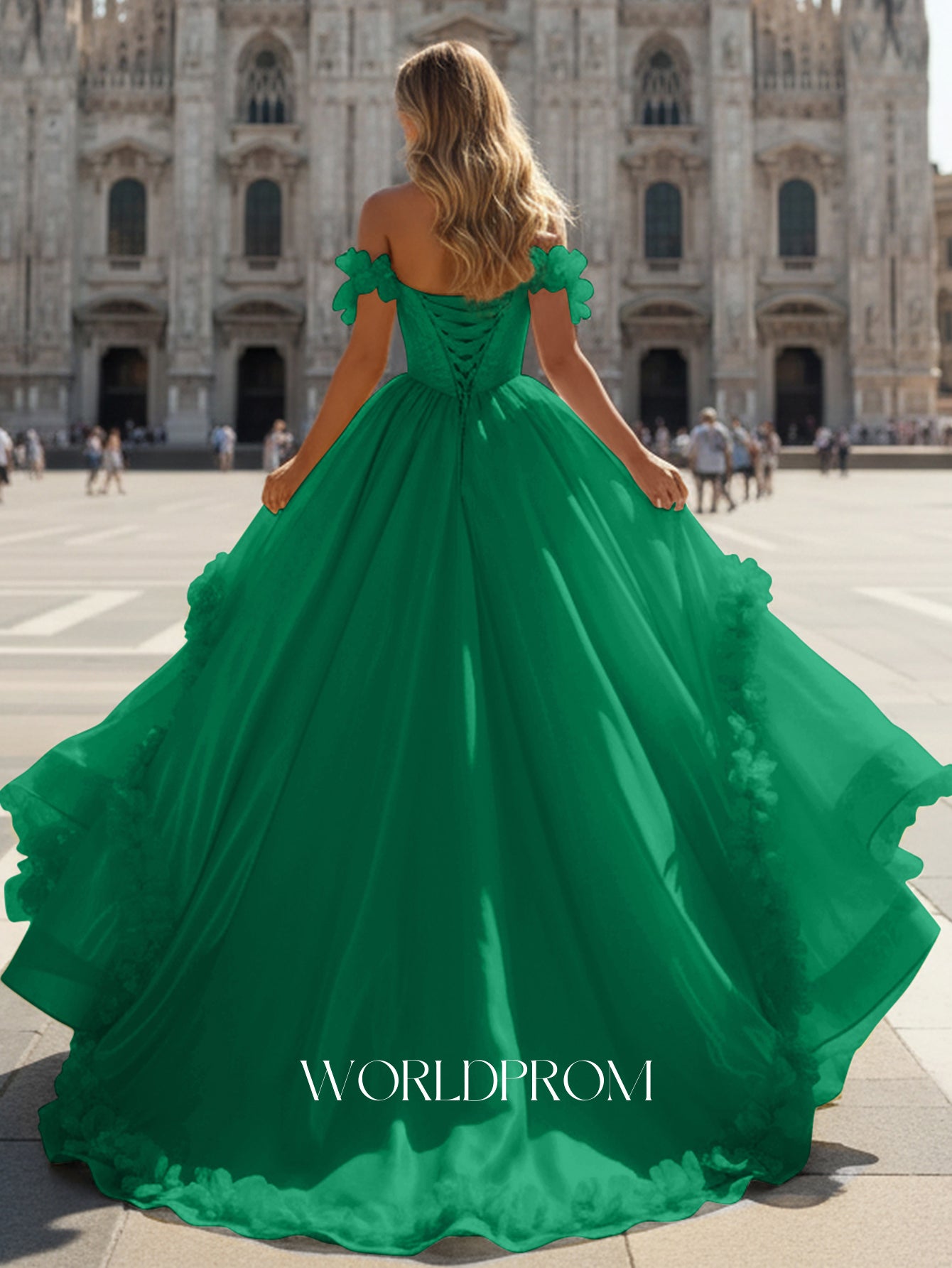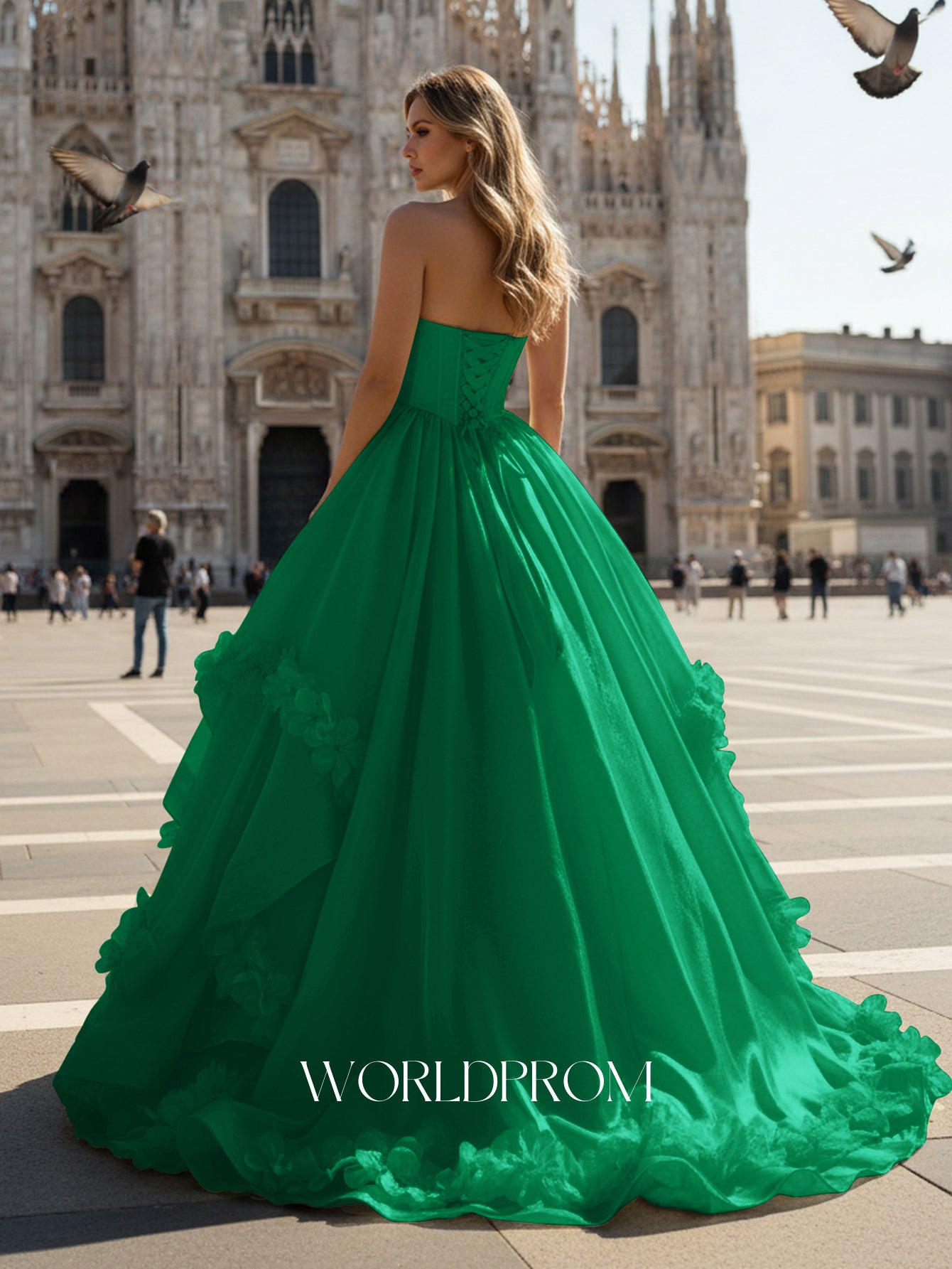This organza prom gown features ruched waist on the bodice. The strapless dress has a scoop neck and pleated hem with 3d flowers. Worldprom ball gown prom dresses are ideal for party, evening or festivals.