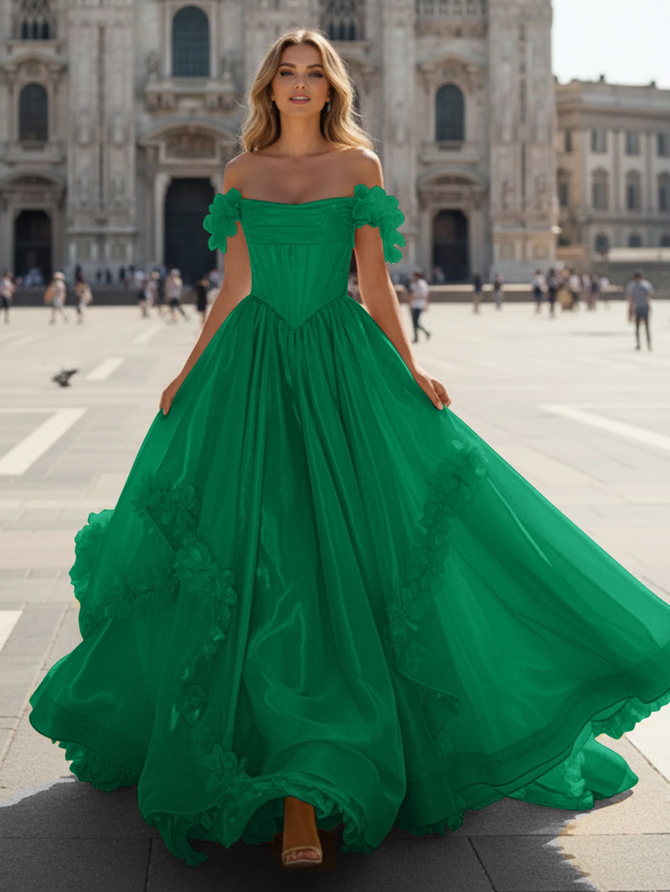 Strapless 3D Flowers Ruched Bust Pleated Long Ball Gown Prom Dress - Emerald Green