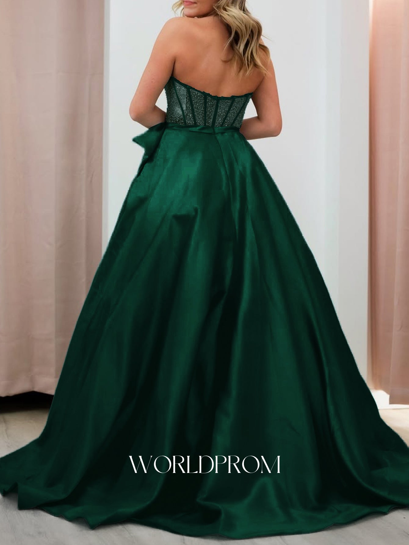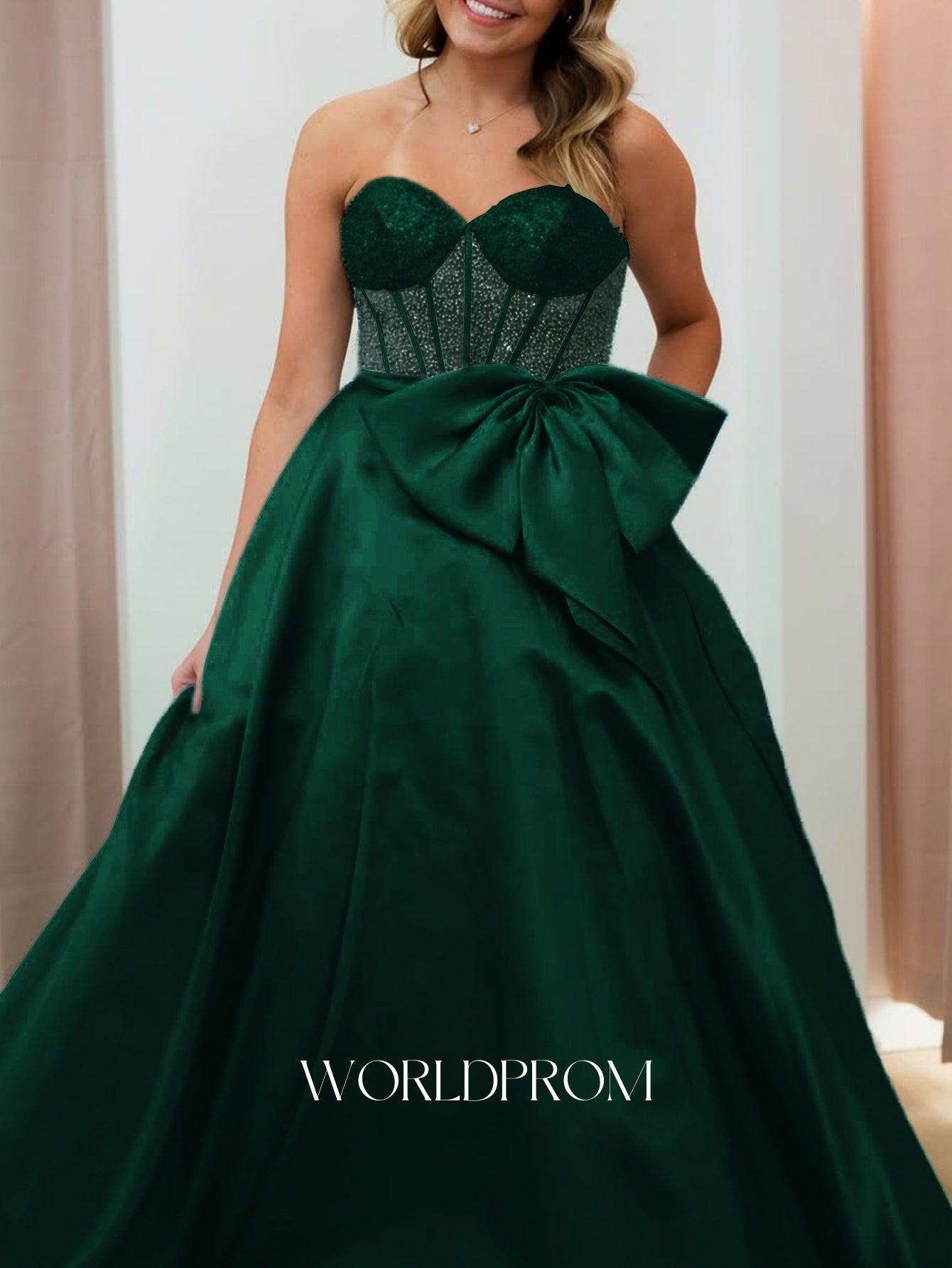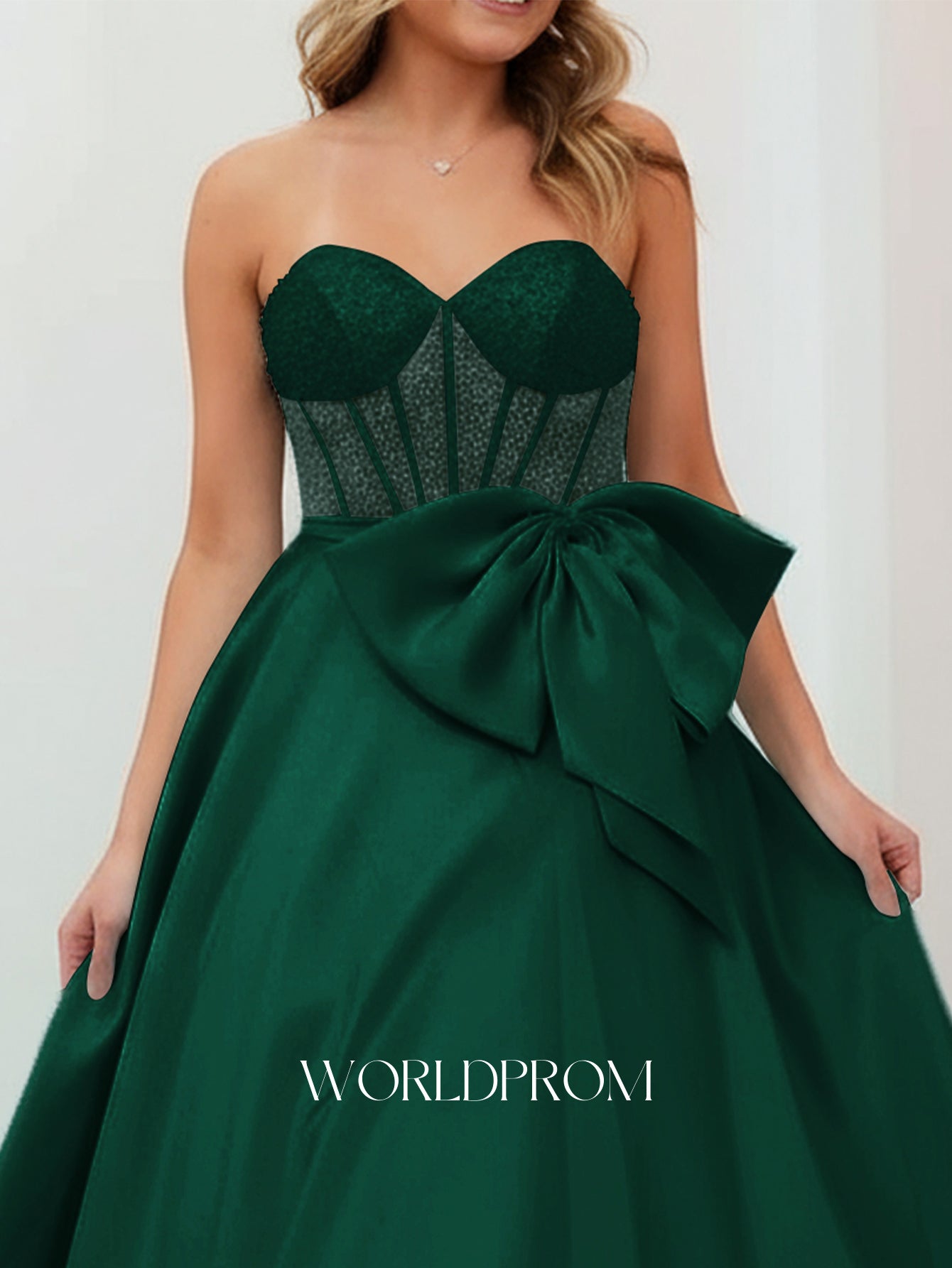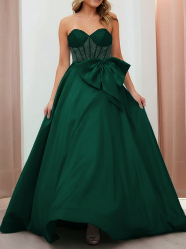This satin prom gown features big bow with sheer on the illusion bodice. The strapless dress has a sweetheart neckline and pleated hem. Worldprom ball gown prom dresses are ideal for party, evening or festivals.