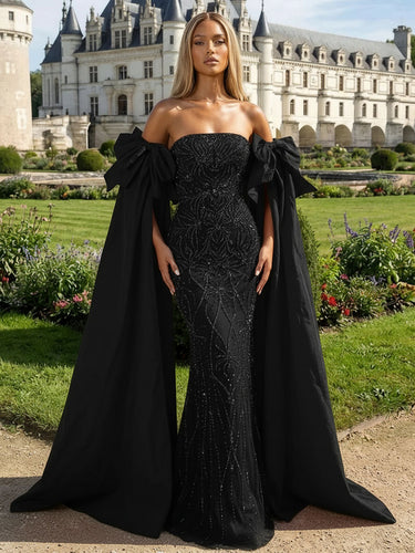 Luxury Removable Sleeves Crystal Mermaid Long Prom Dress - Black