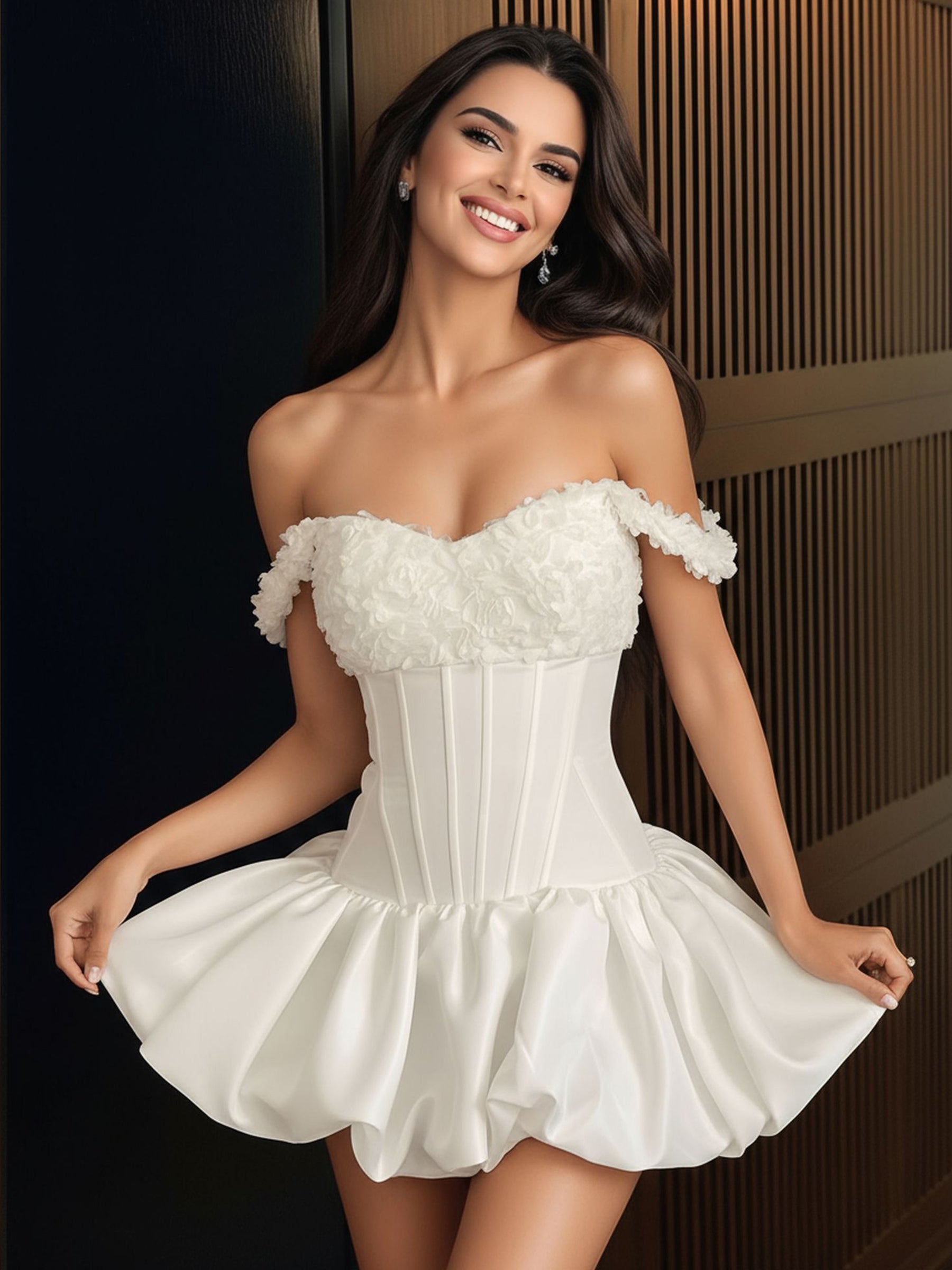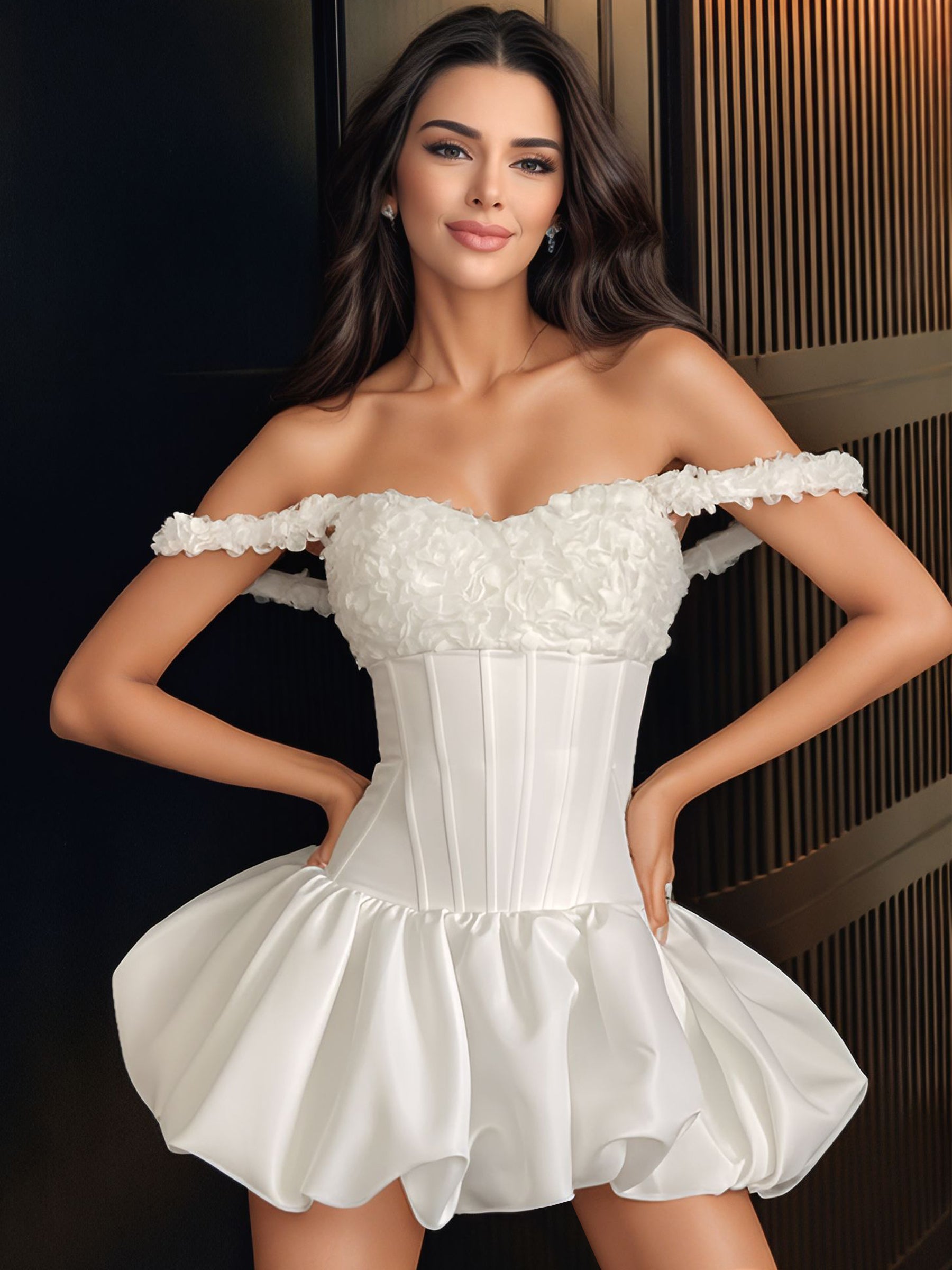 This satin bubble dress features 3d flowers on the bodice. The off shoulder dress has a sweetheart neckline and bubble hem. The ball gown mini skirt is ideal for graduation party, homecoming or prom party.