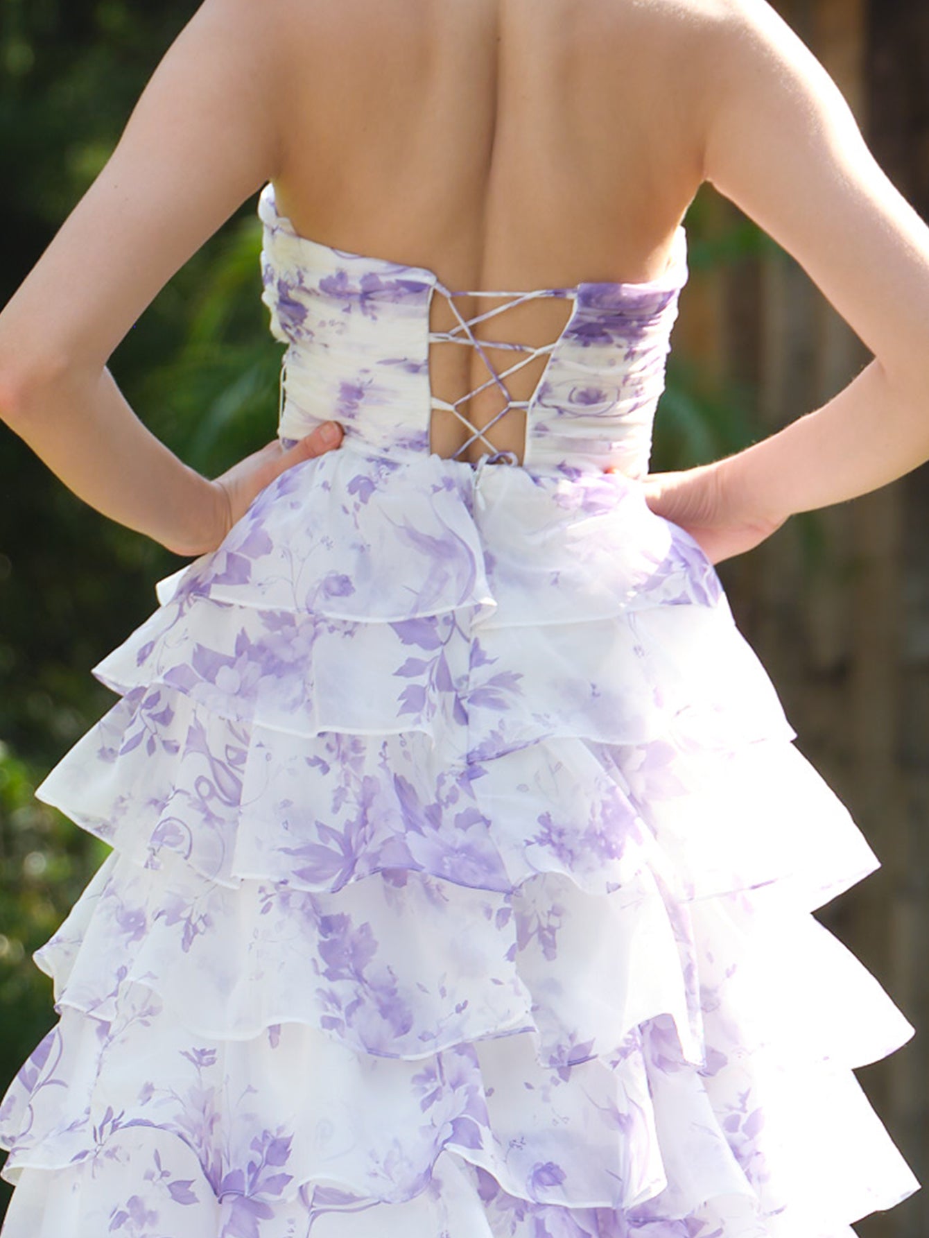 Sweetheart Ruffle Printing Chiffon Tiered Ball Gown Prom Dress - Lilac Floral