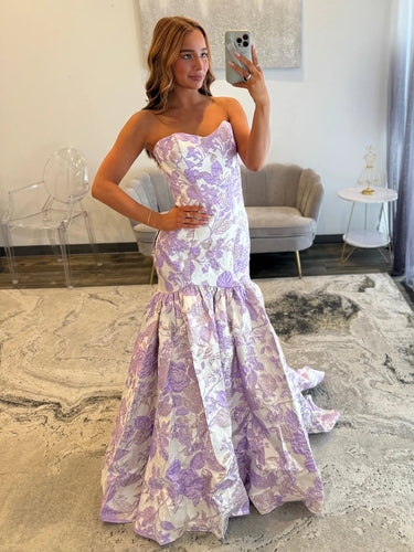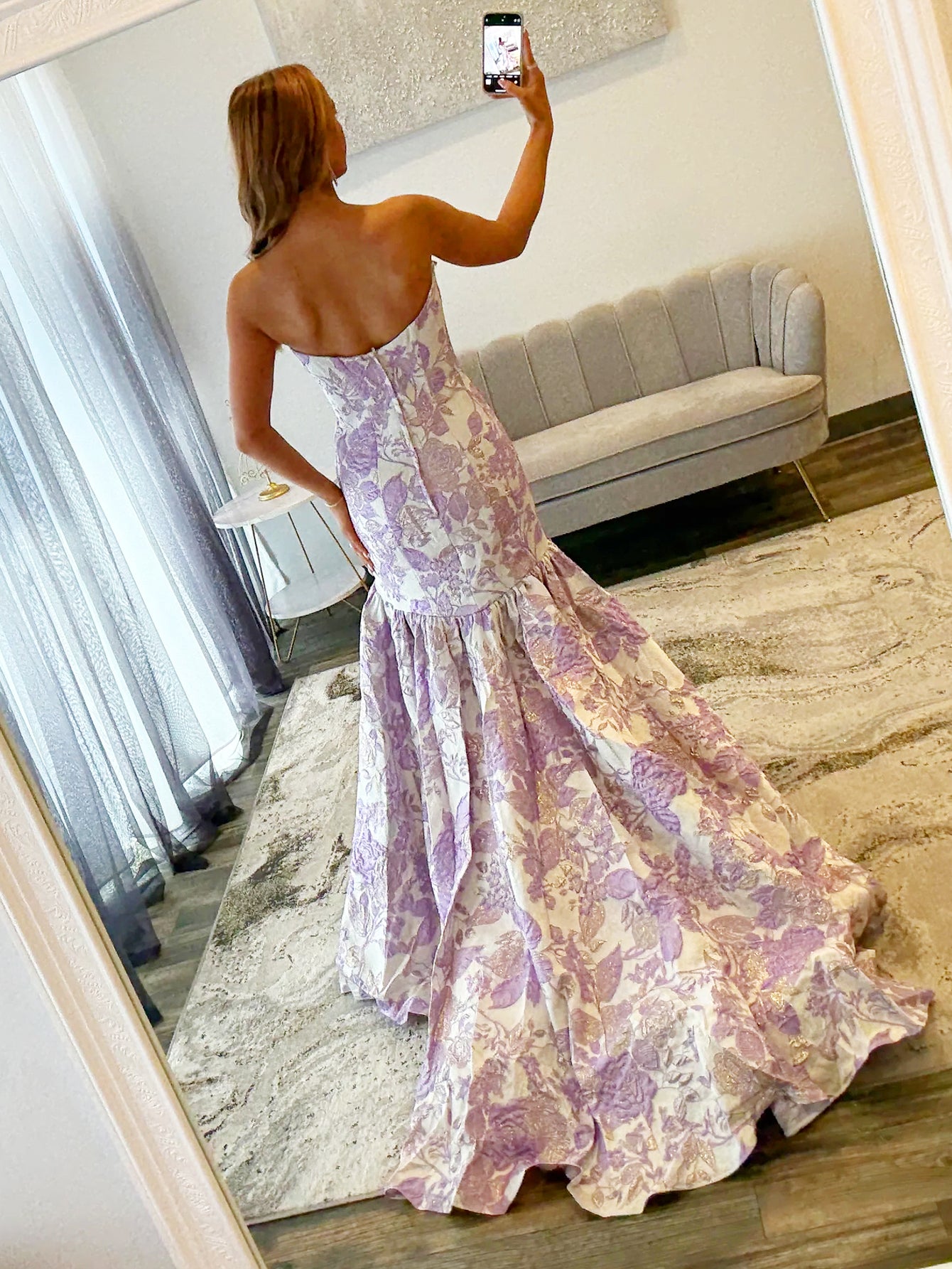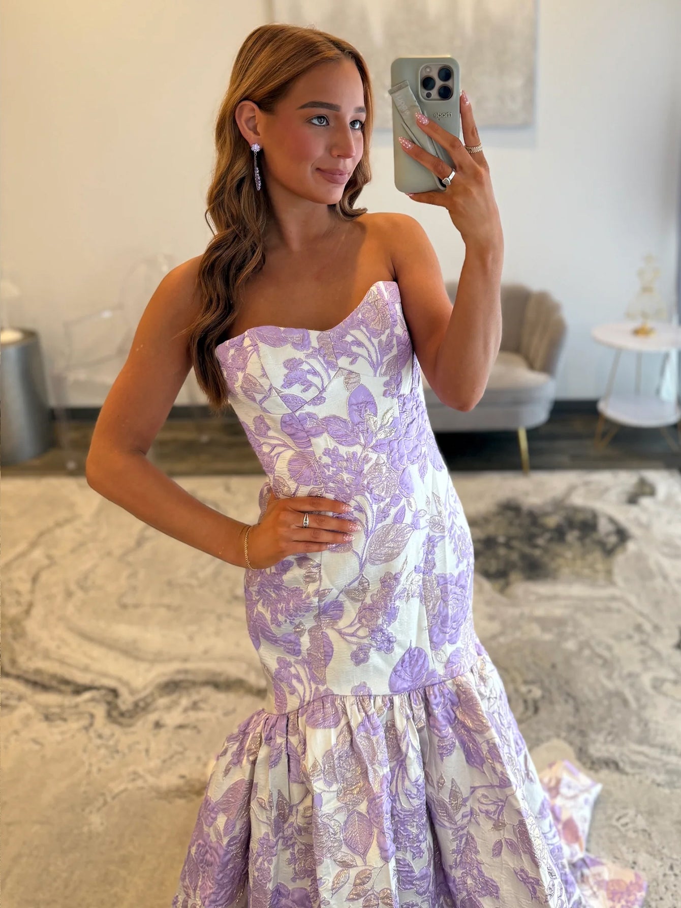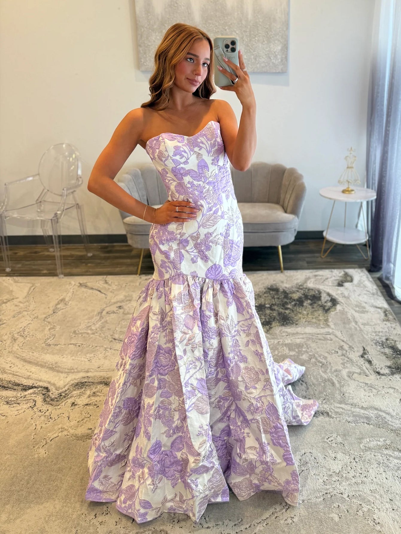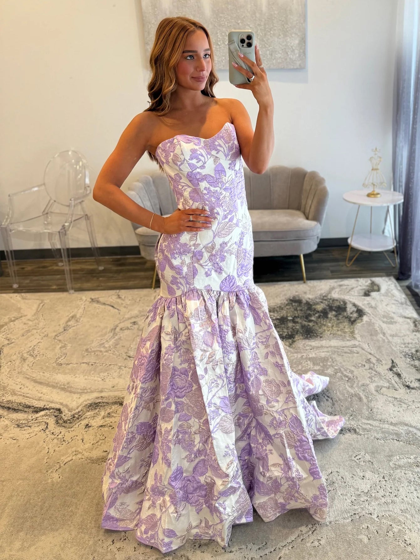 Embroidery Strapless Pleated Long Mermaid Bodice Prom Dress - Lilac Floral
