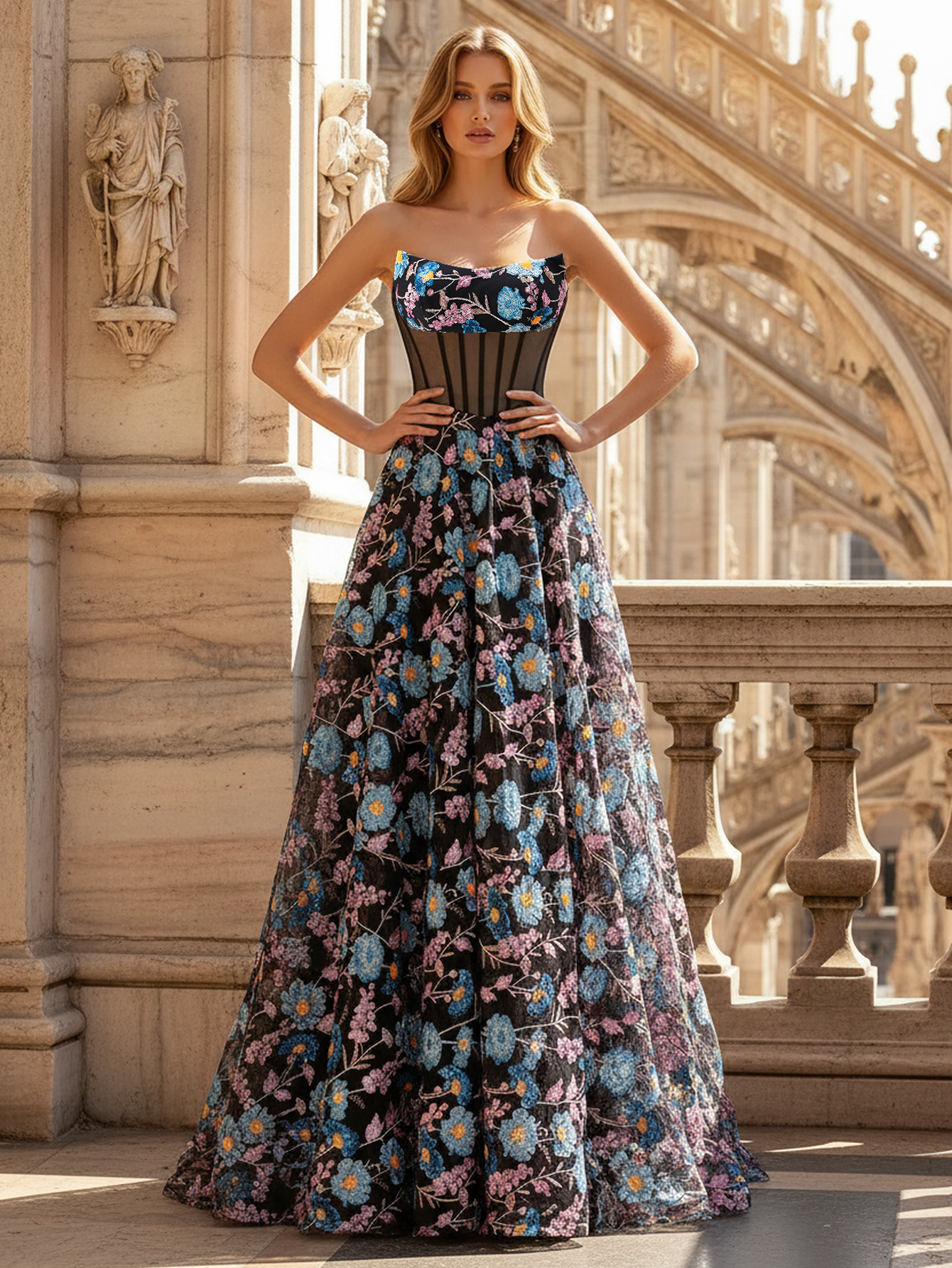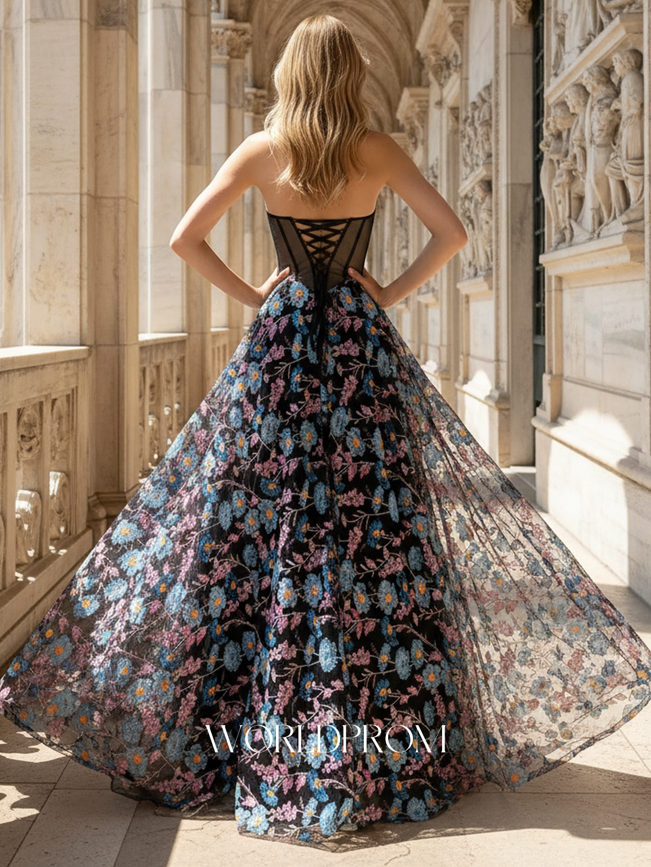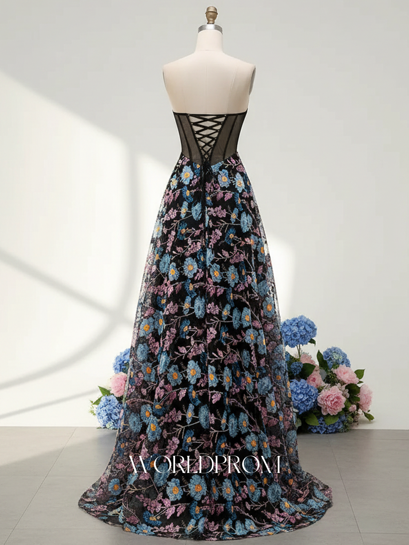 Floral Pleated Corset Illusion Lace Up A-Line Long Prom Dress - Black Floral