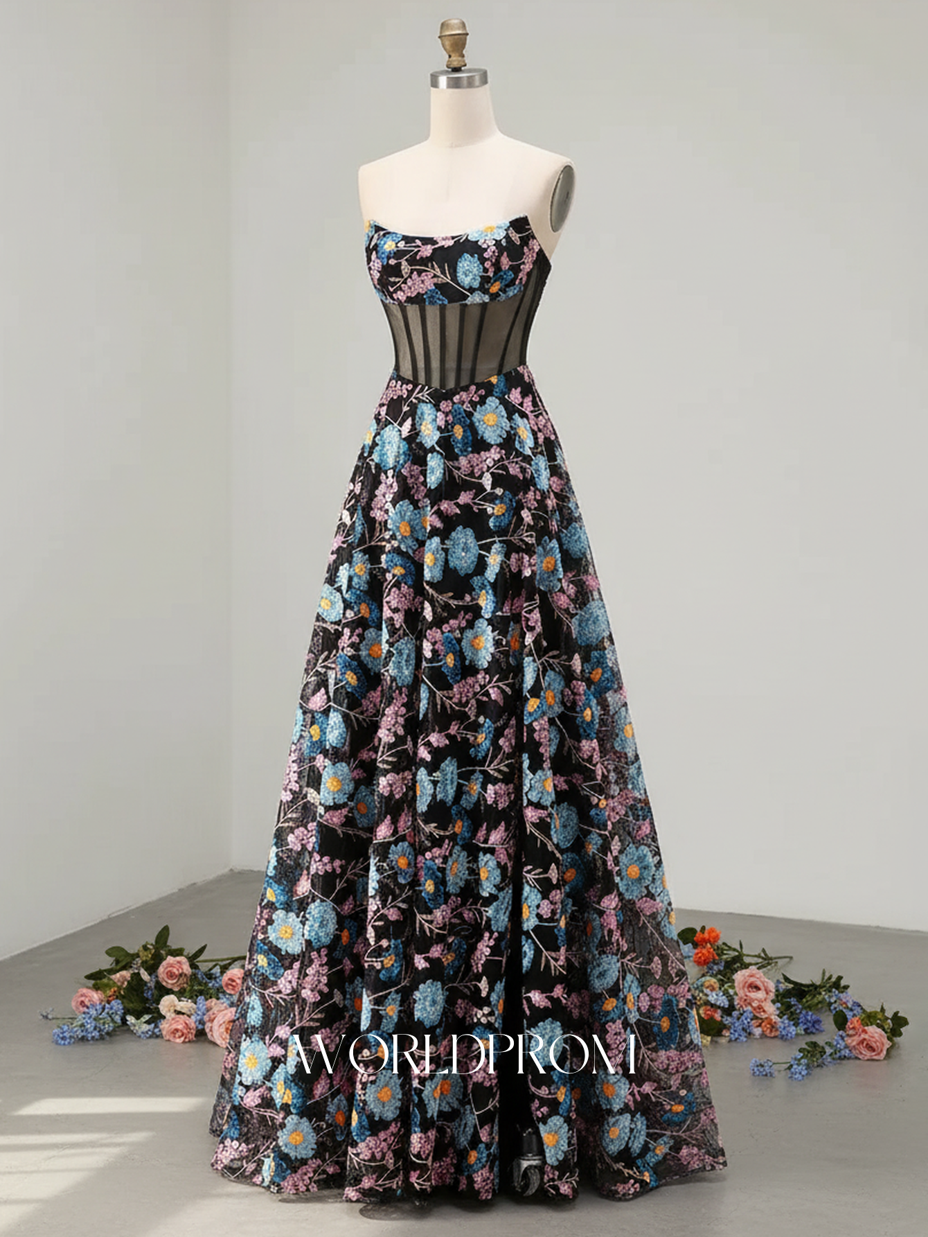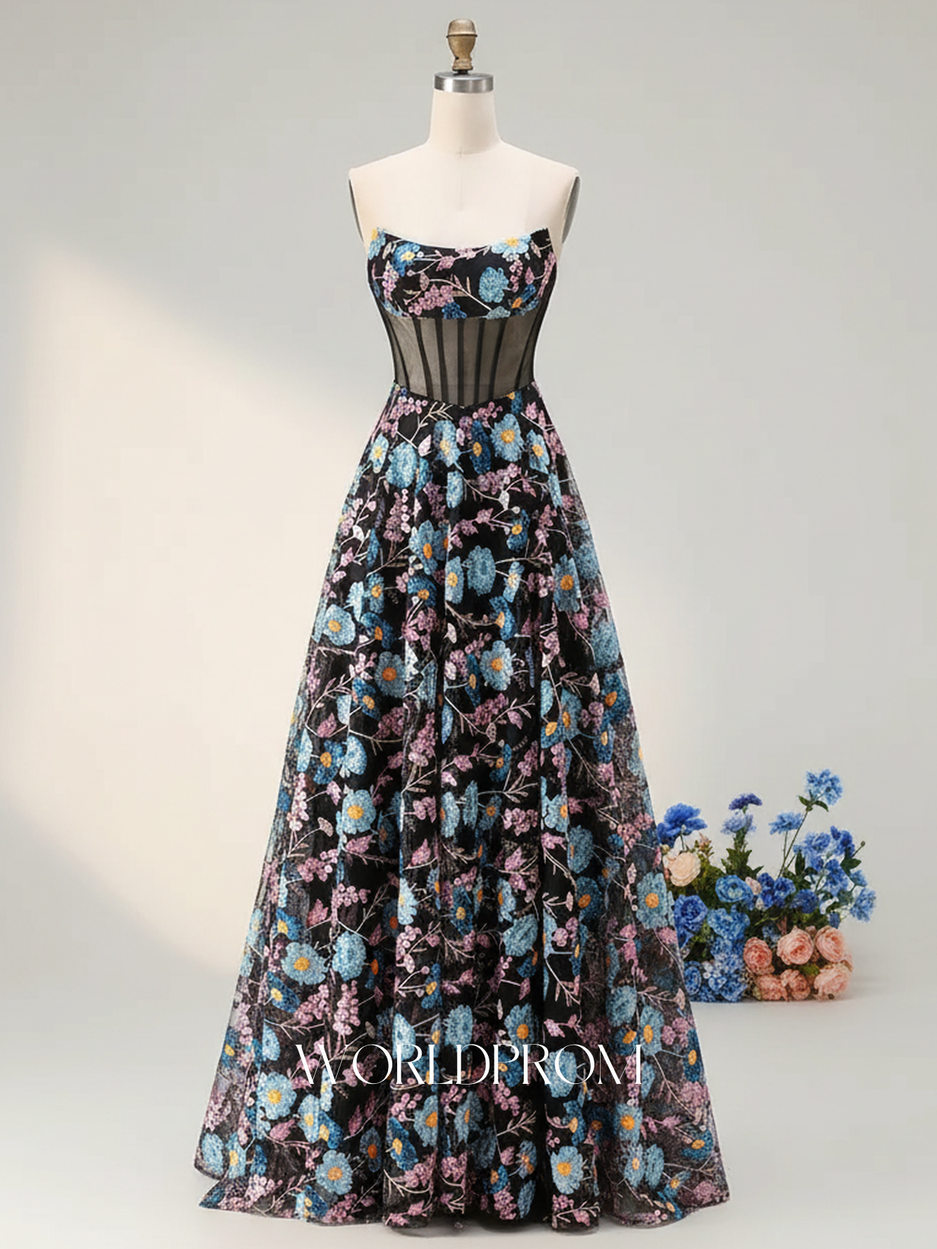 This sequin prom gown features floral ruched bust on the illusion bodice. The strapless dress has a scoop neckline and pleated hem. Worldprom a-line prom dresses are ideal for party, evening or festivals.