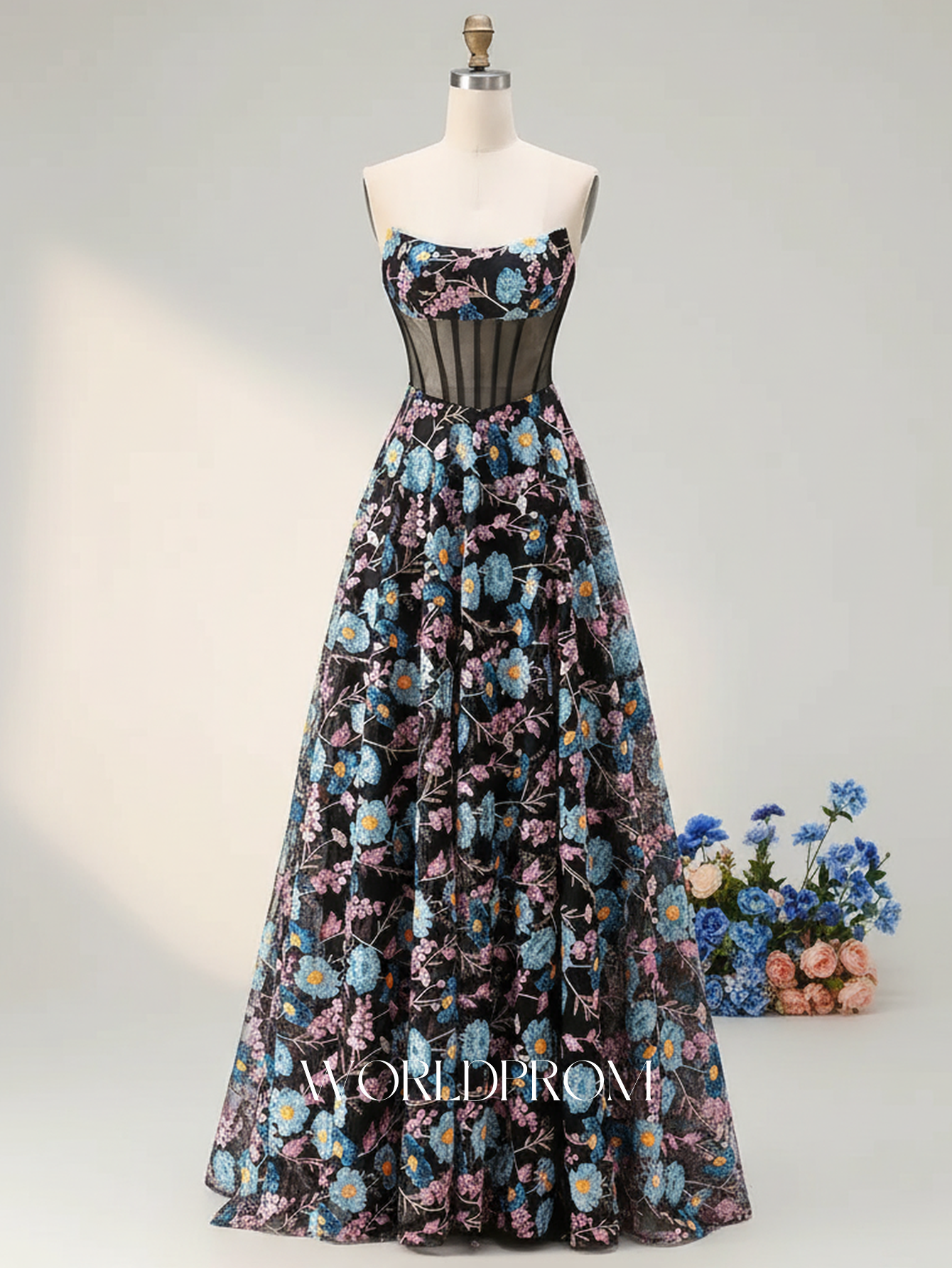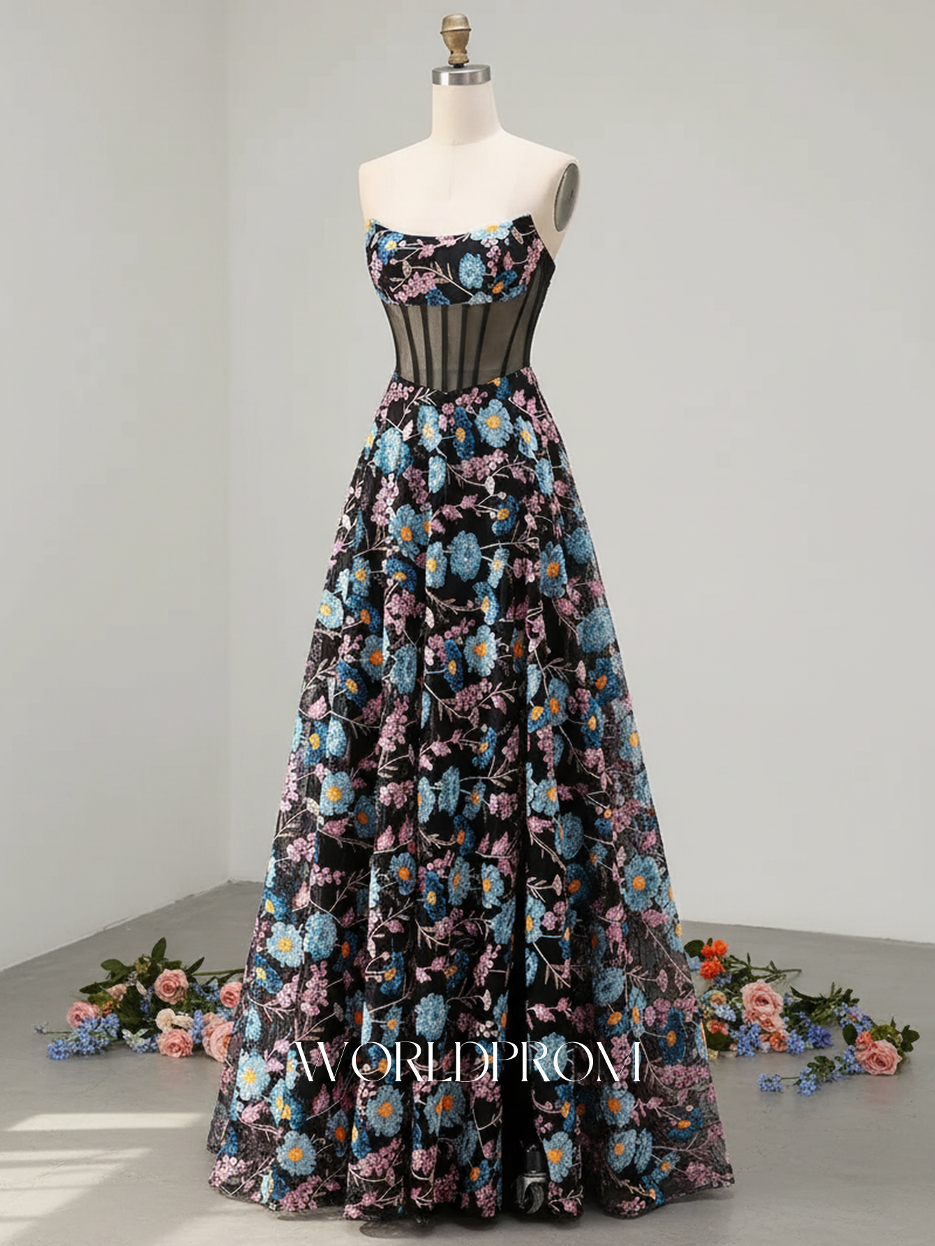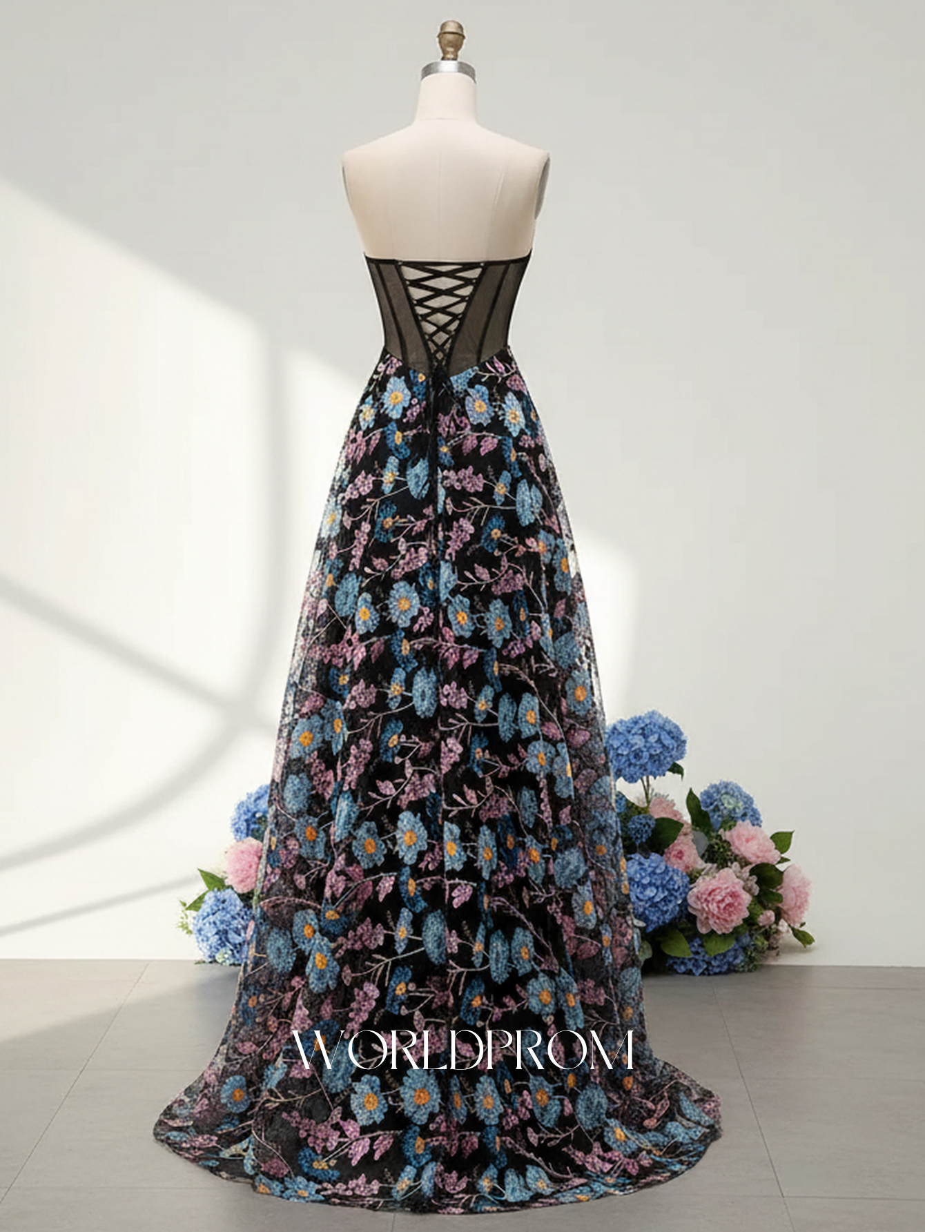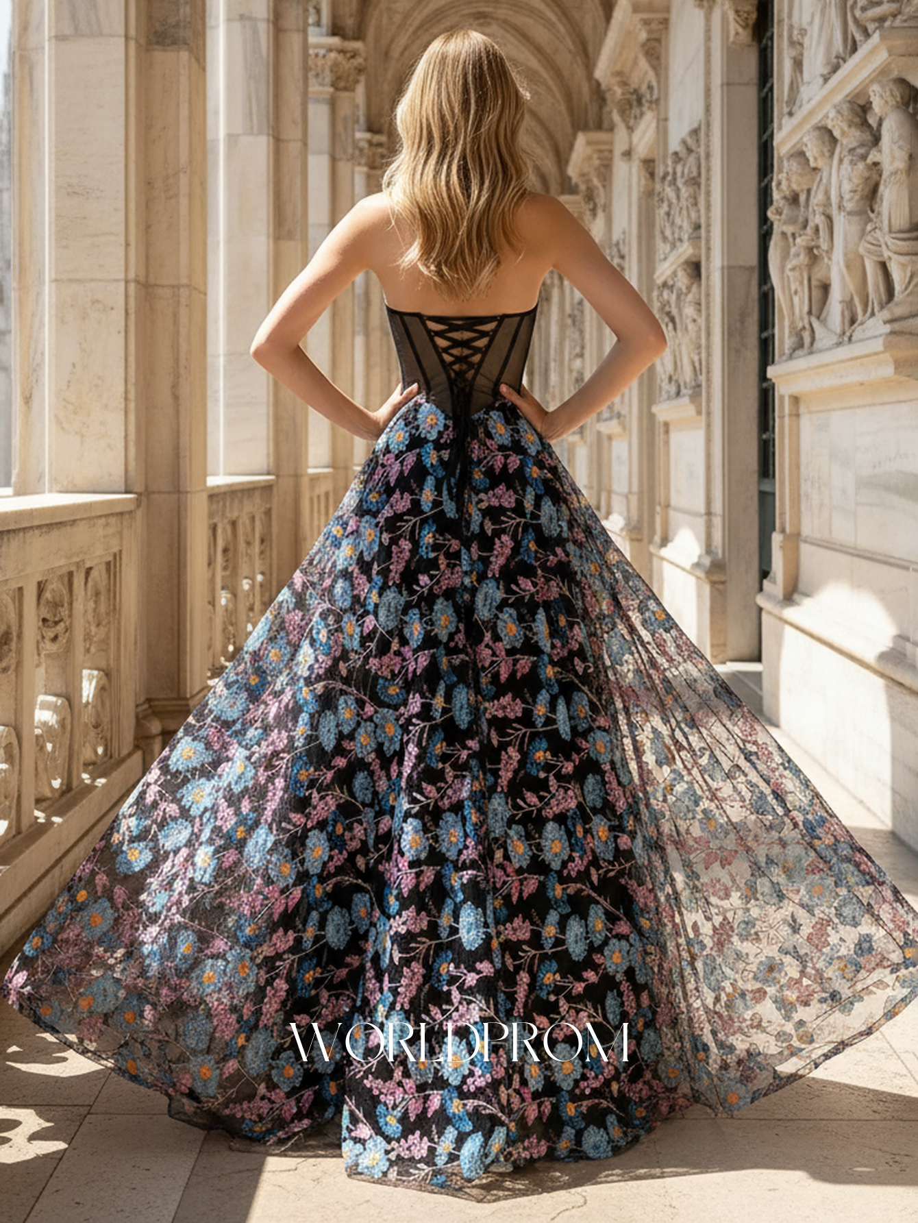 Floral Pleated Corset Illusion Lace Up A-Line Long Prom Dress With Slit - Black Floral