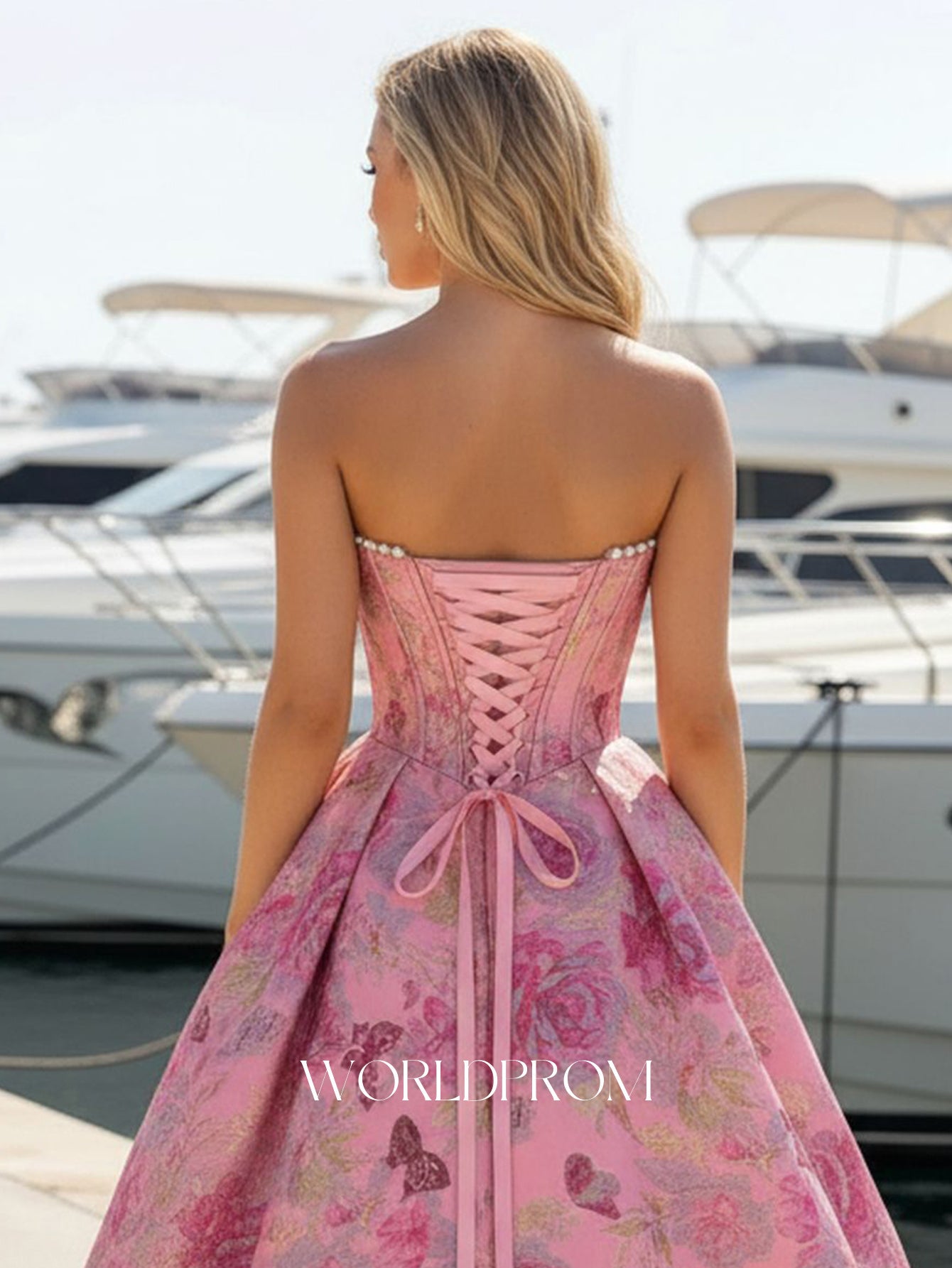 This satin prom gown features pearls like with corset on the bodice. The strapless dress has a scoop neckline and split hem. Worldprom mermaid prom dresses are ideal for party, evening or festivals.