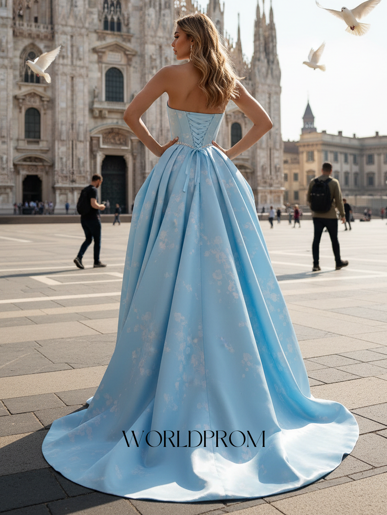 This satin prom gown features ruched bust with sparkly on the bodice. The strapless floral dress has a scoop neckline and pleated hem. Worldprom ball gown prom dresses are ideal for party, evening or festivals.