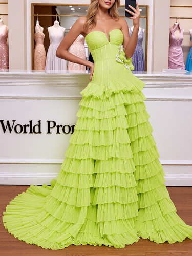 3D Rose Waist Strapless Tiered Ball Gown Evening Dress - Fluorescent