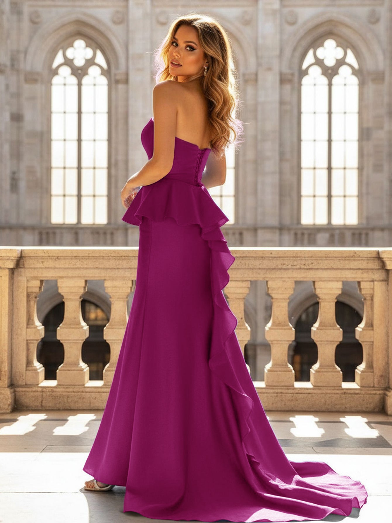 Details: Backless, Fitted Waist, Waist Drop, Split, Ruffle