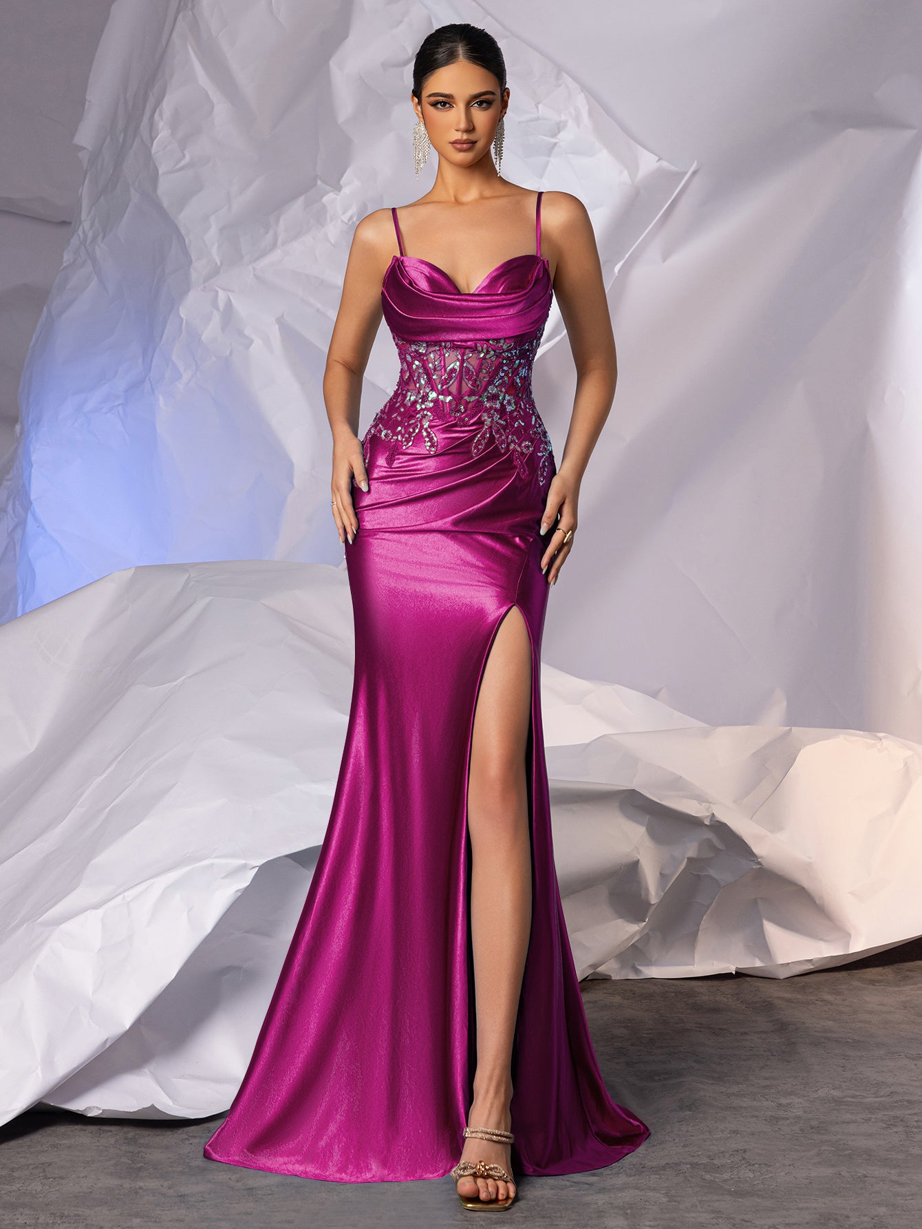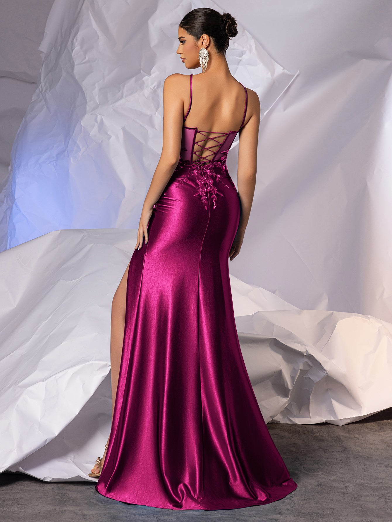 This satin prom gown features lace embroidery and ruched bust on the illusion bodice. The backless maxi dress has a sweetheart neckline and split hem. Mermaid formal dresses are ideal for party, evening or festivals.