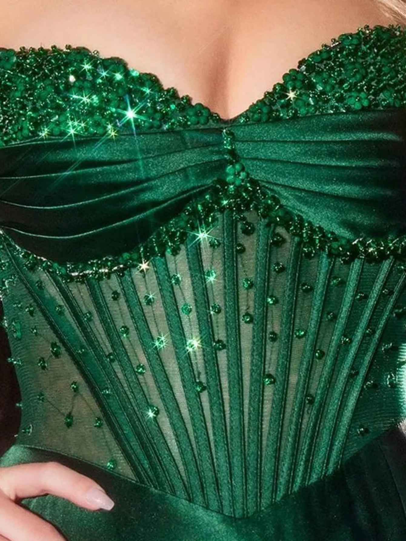 Beading Illusion Ruched Bodice Mermaid Prom Dress With Detachable Sleeves - Emerald Green