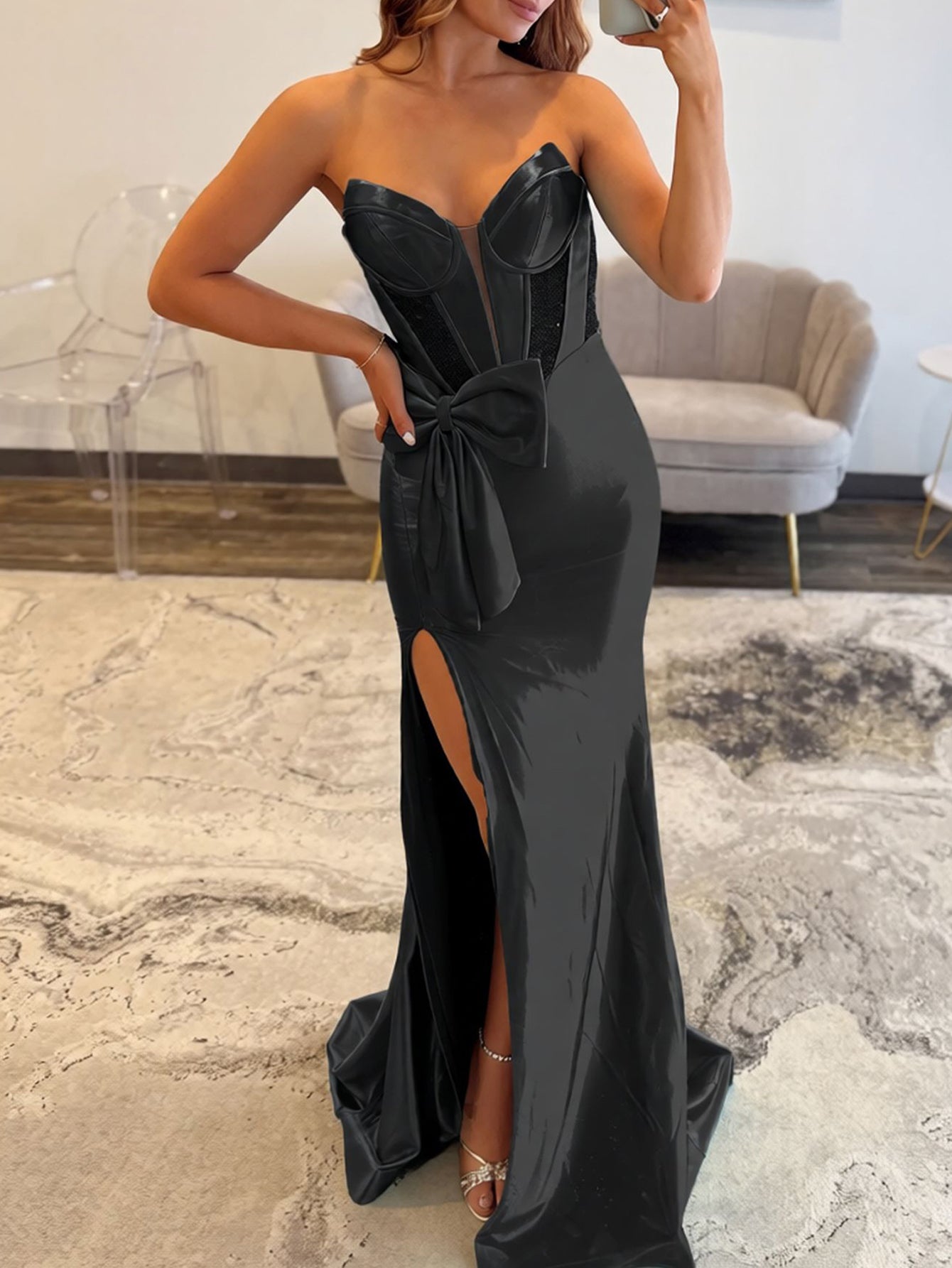 Details: Backless, Split, Sparkly, Corset, Big Bow