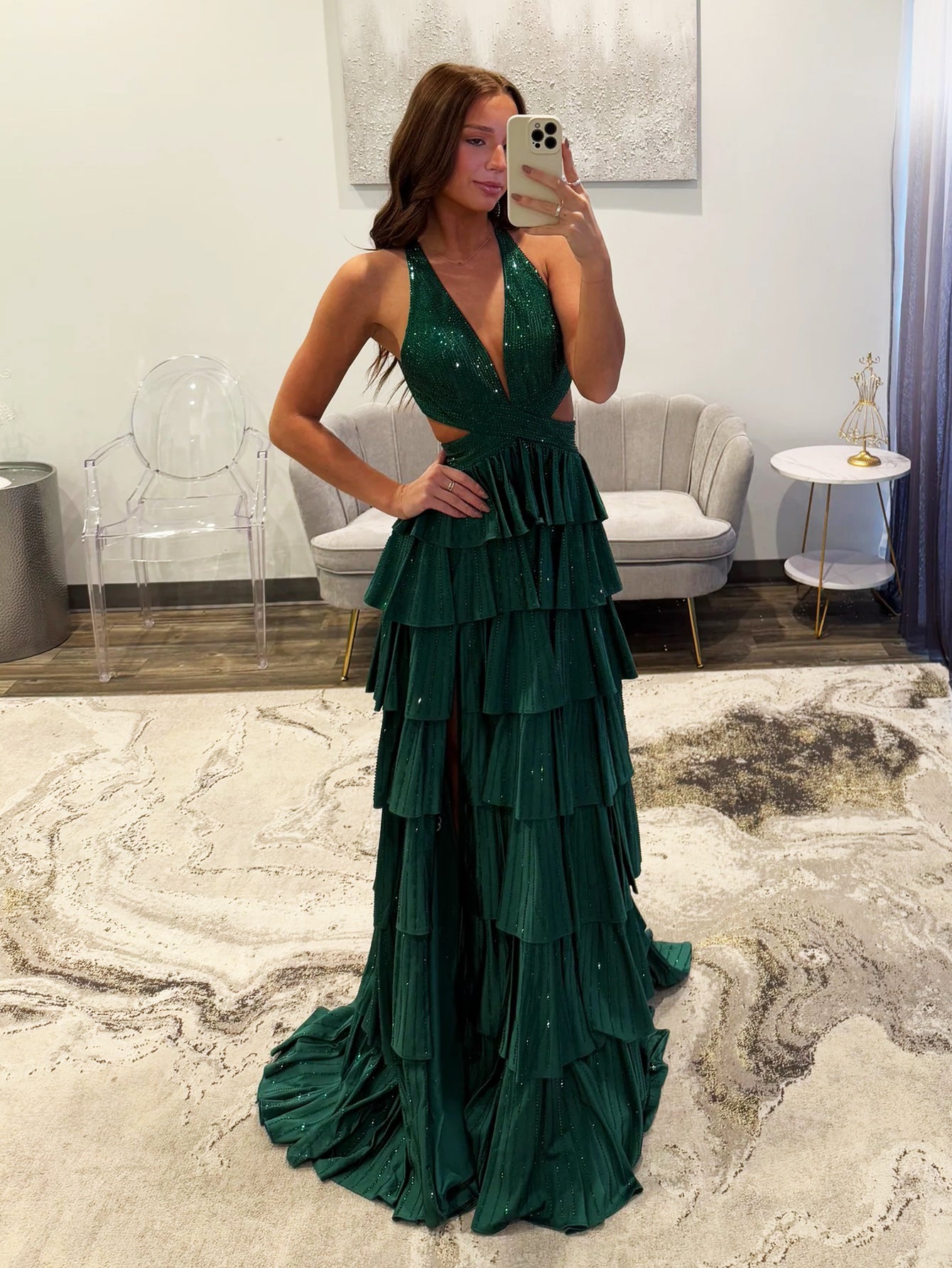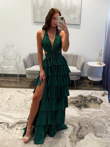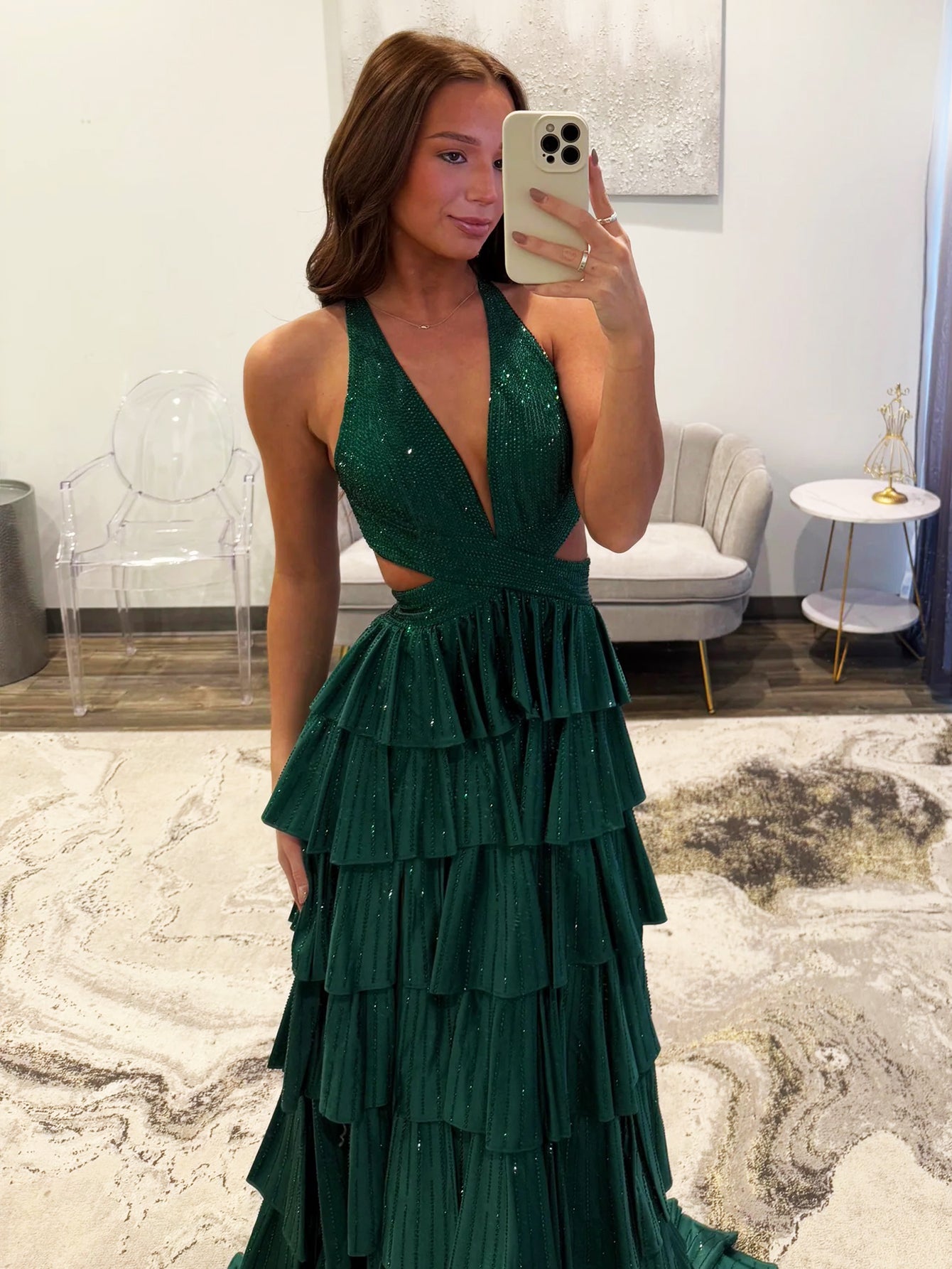 Cut Waist Halter Crystal Ruffle Ball Gown Prom Dress - Emerald Green