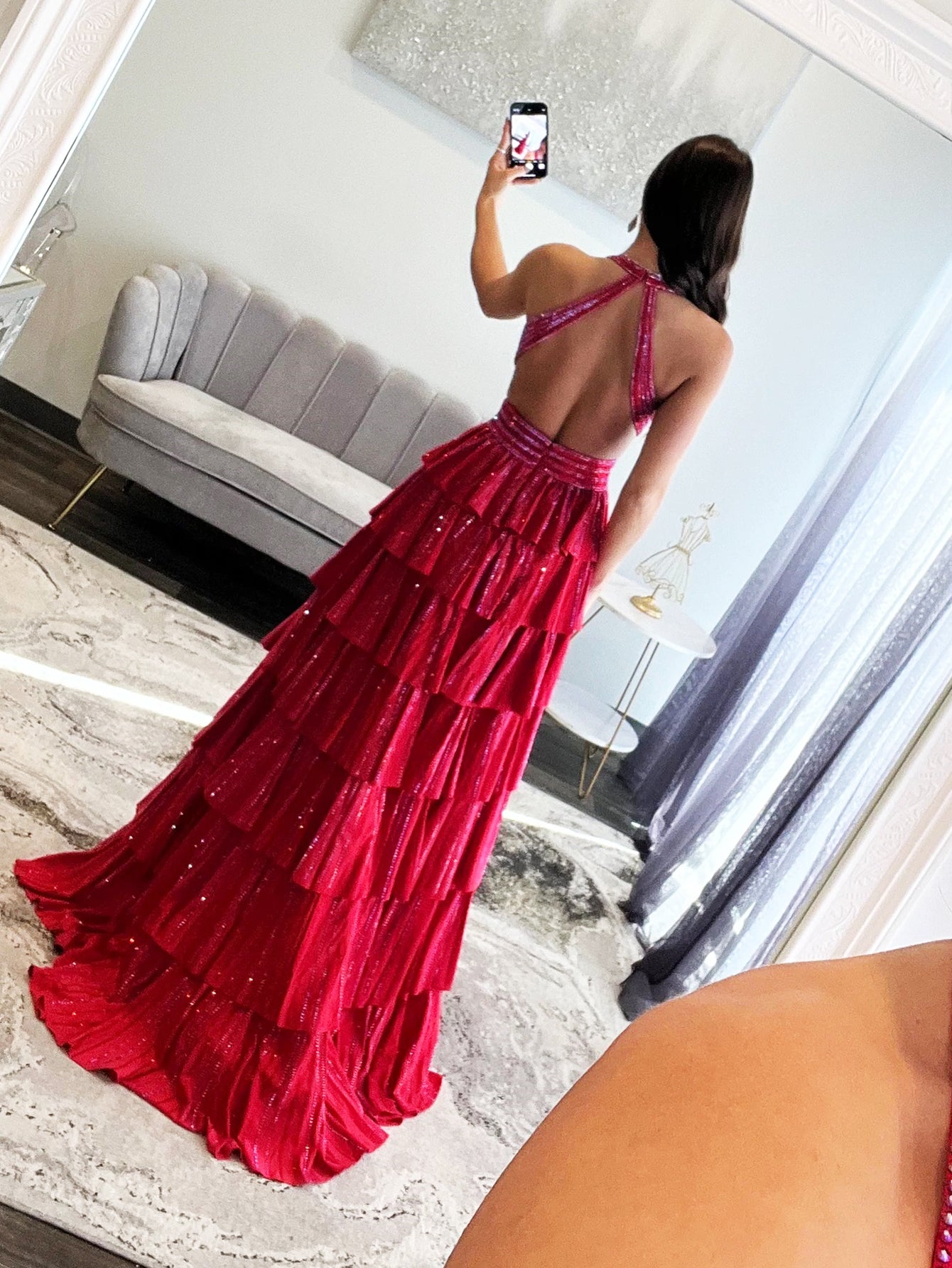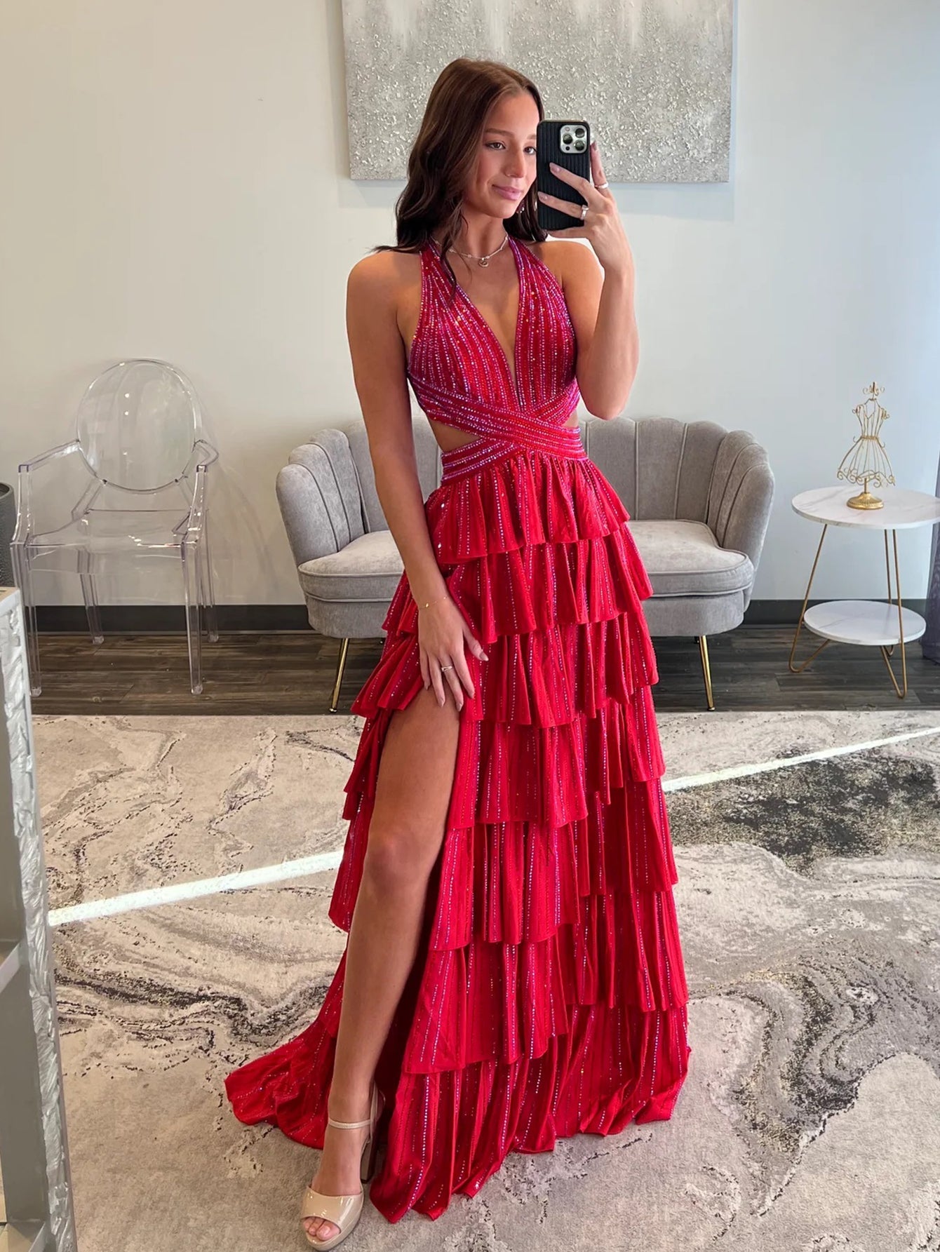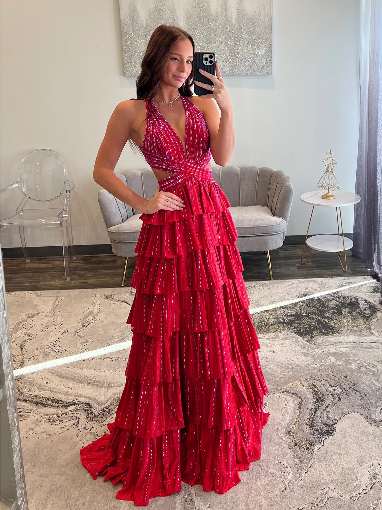 Cut Waist Halter Crystal Ruffle Ball Gown Prom Dress - Red