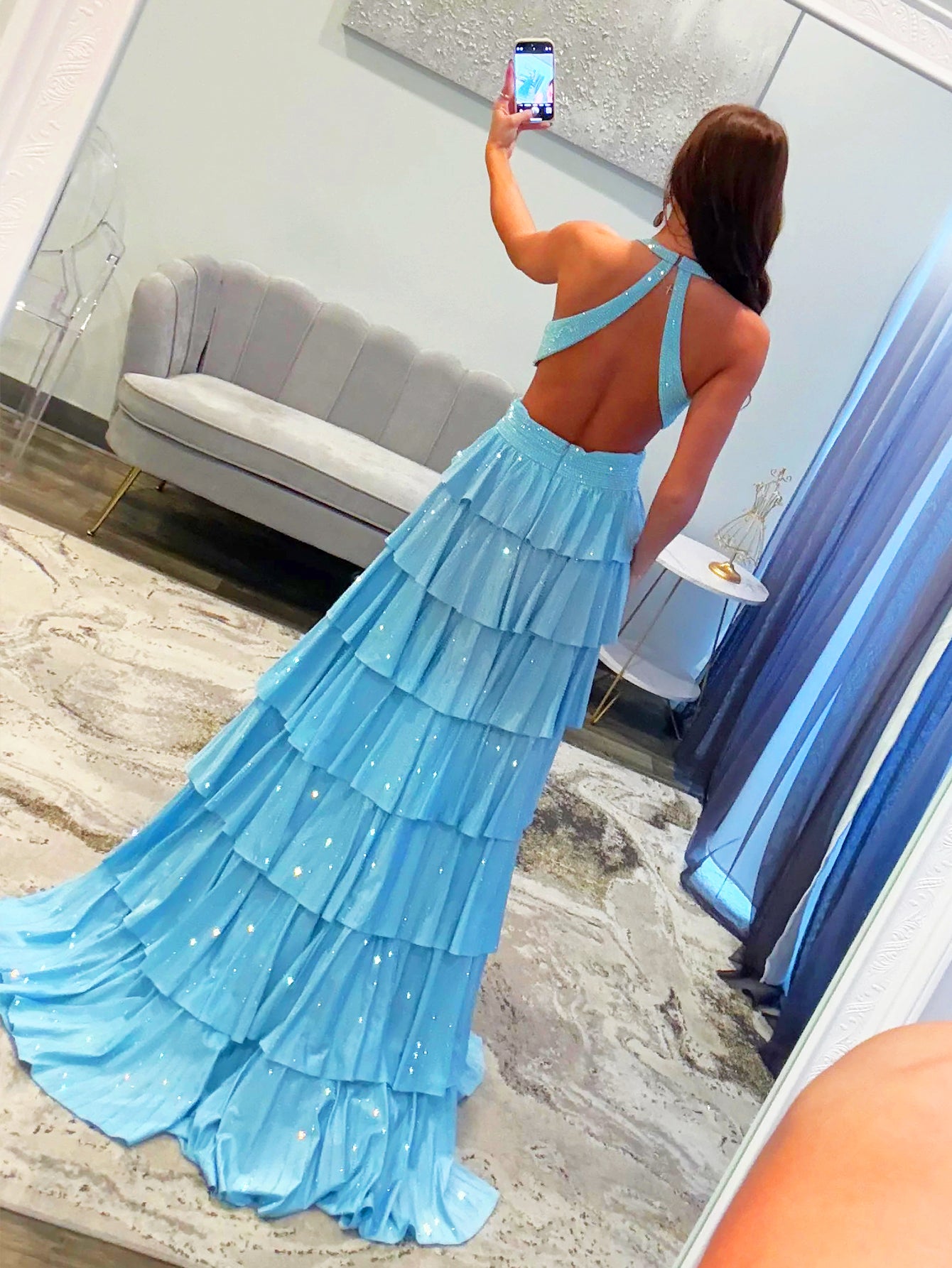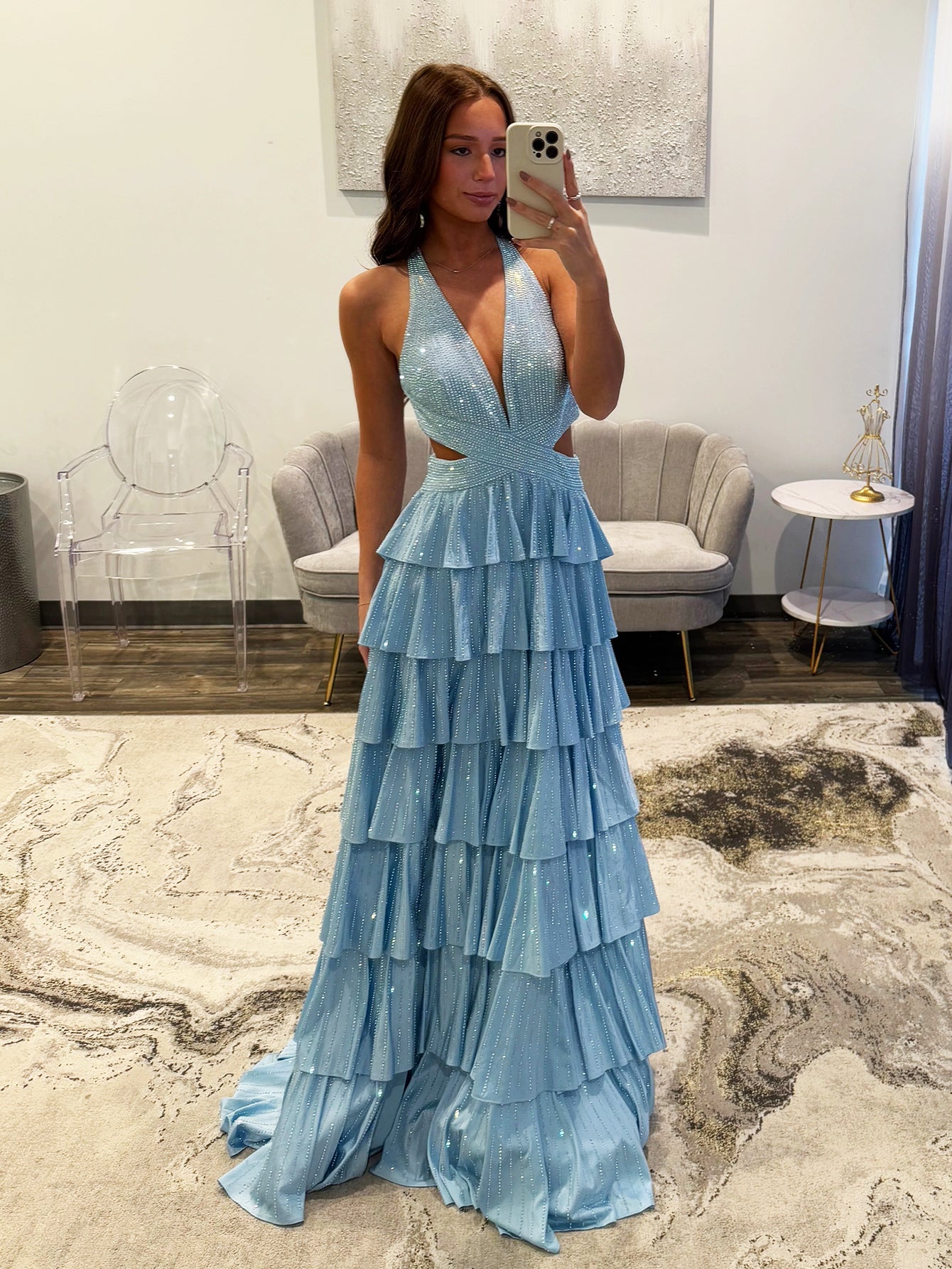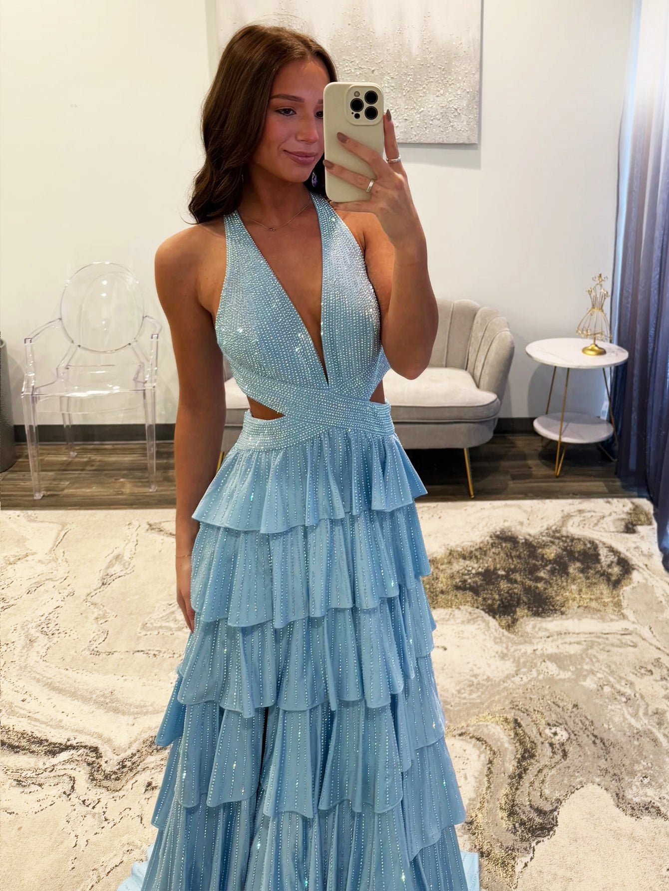 Cut Waist Halter Crystal Ruffle Ball Gown Prom Dress - Sky Blue