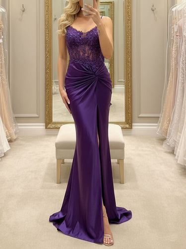 Lace Embroidery Twist Mermaid Long Prom Dress - Purple