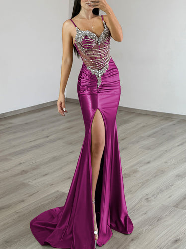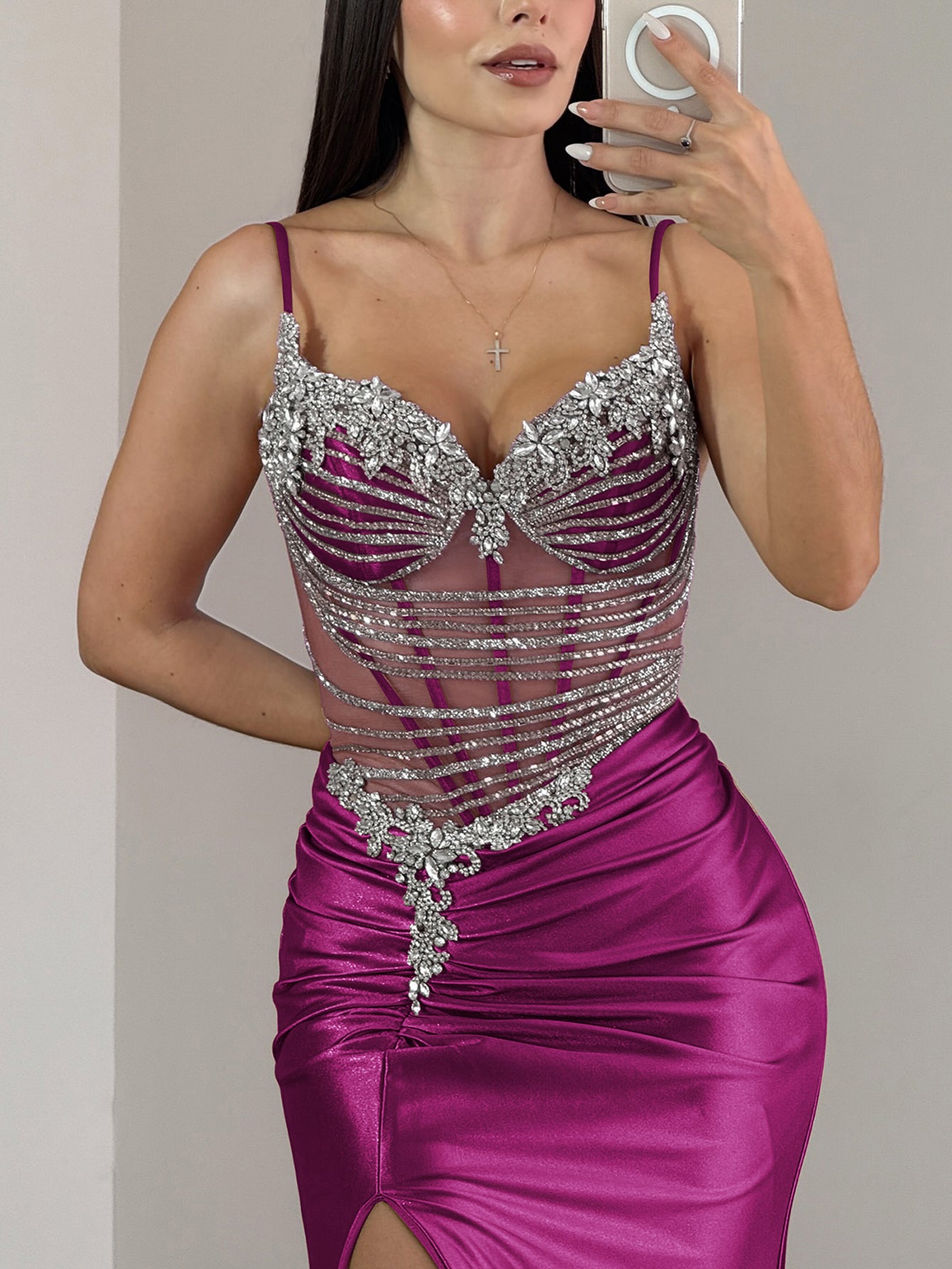 This satin prom gown features crystals on the bodice. The spaghetti straps luxury maxi dress has a sweetheart neckline and split hem. Dubai ruched formal dresses are ideal for party, evening or festivals.