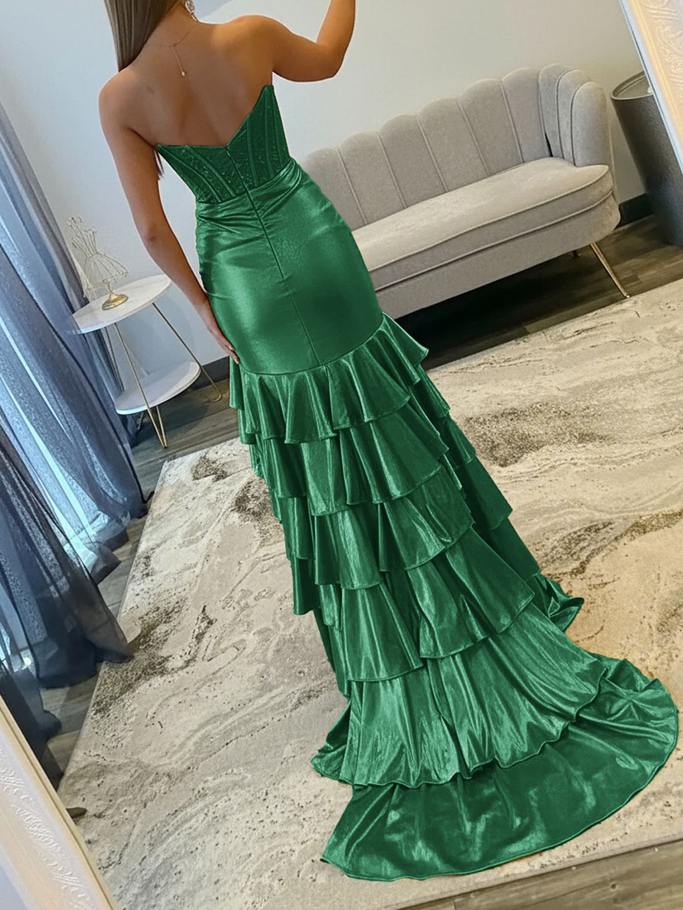 Luxury Crystal Ruffle Mermaid Prom Dress - Emerald Green