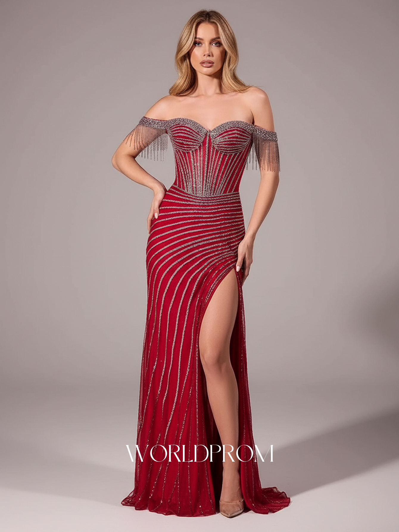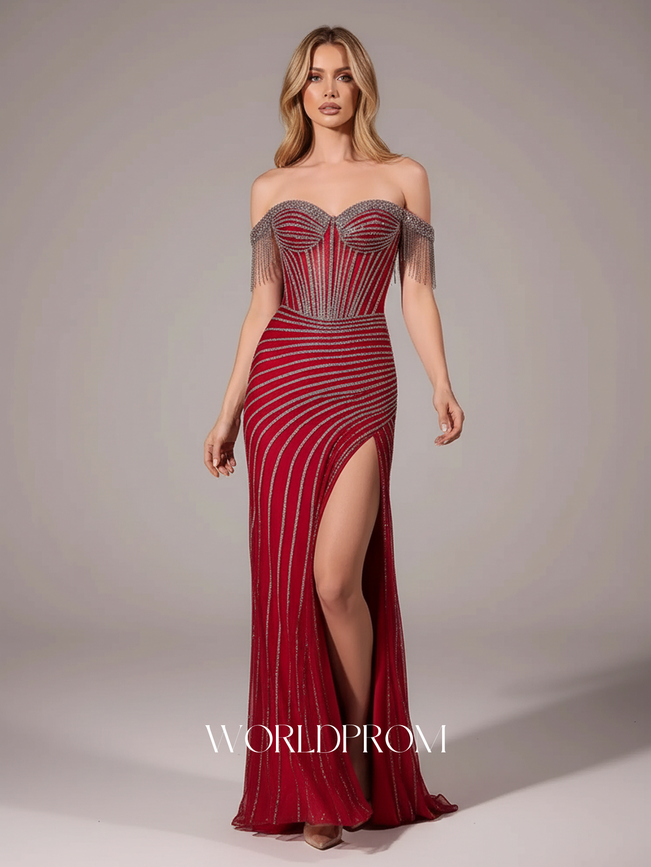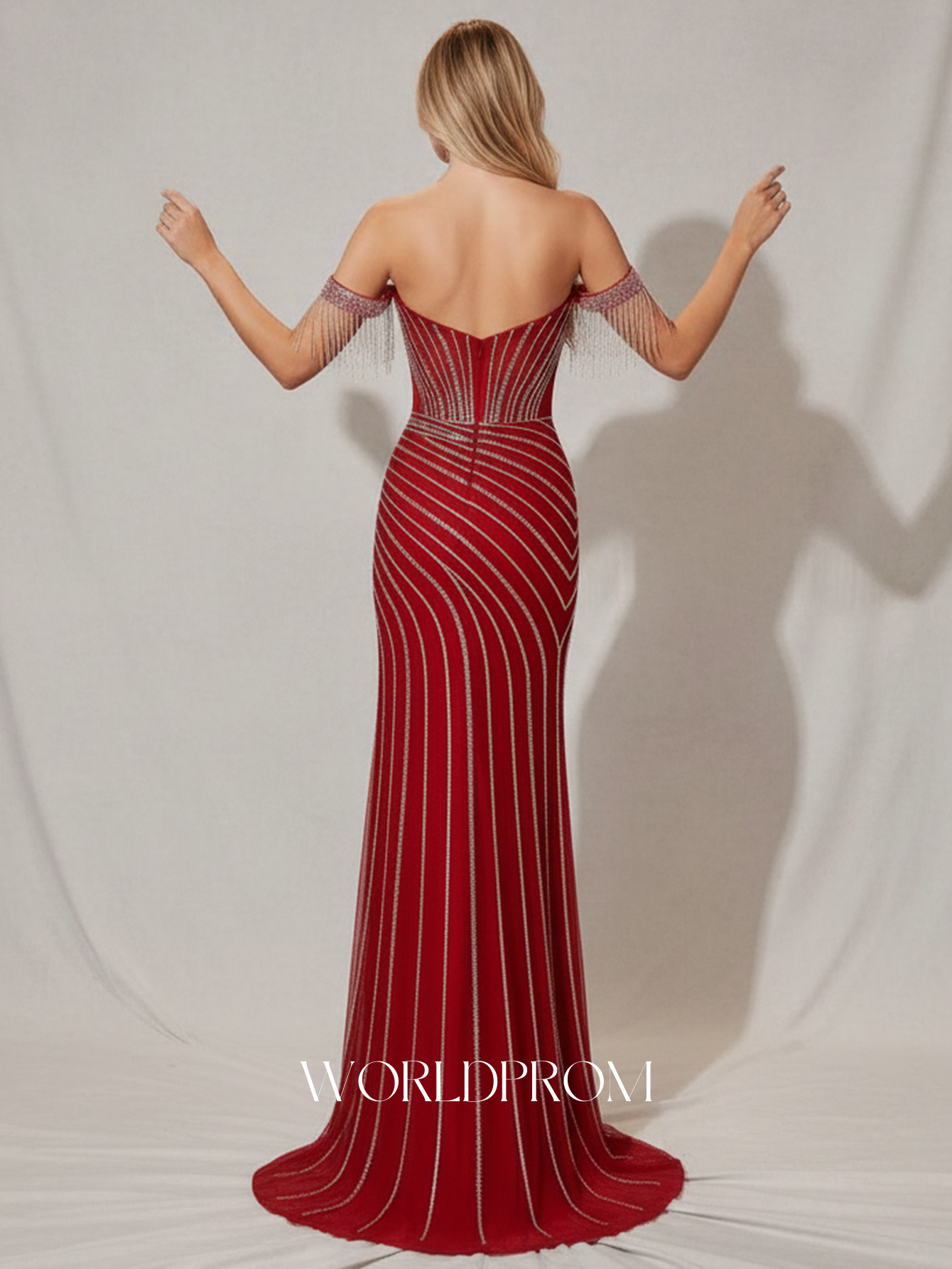This crystal dress features tassels beading with sheer on the illusion bodice. The off-shoulder dress has a sweetheart neckline and split hem. Mermaid luxury prom dresses are ideal for party, evening or festivals.