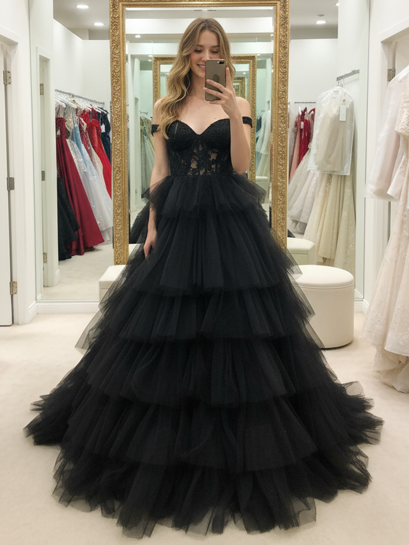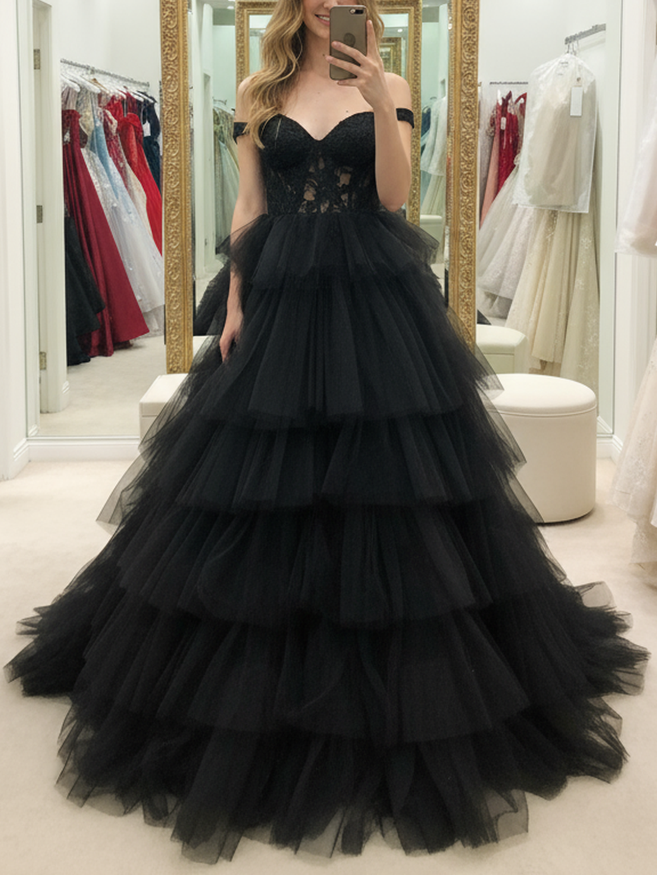 Off Shoulder Ruffled Tiered Lace Embroidery Tulle Ball Gown Prom Dress - Black
