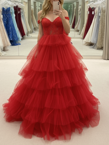 Off Shoulder Ruffled Tiered Lace Embroidery Tulle Ball Gown Prom Dress - Red