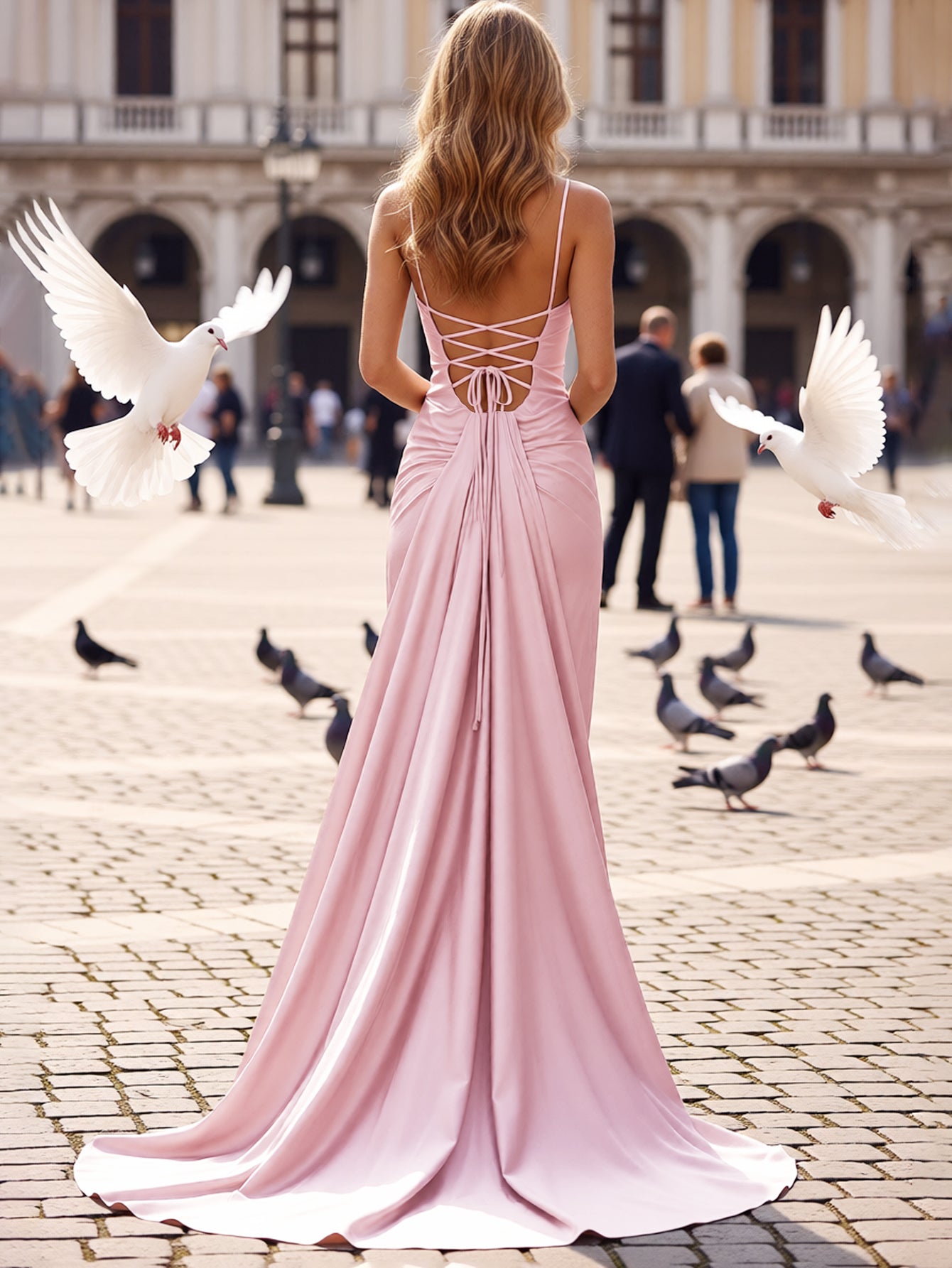 Details: Backless, Sparkly, Beading, Ruched, Lace Up, Drop Train