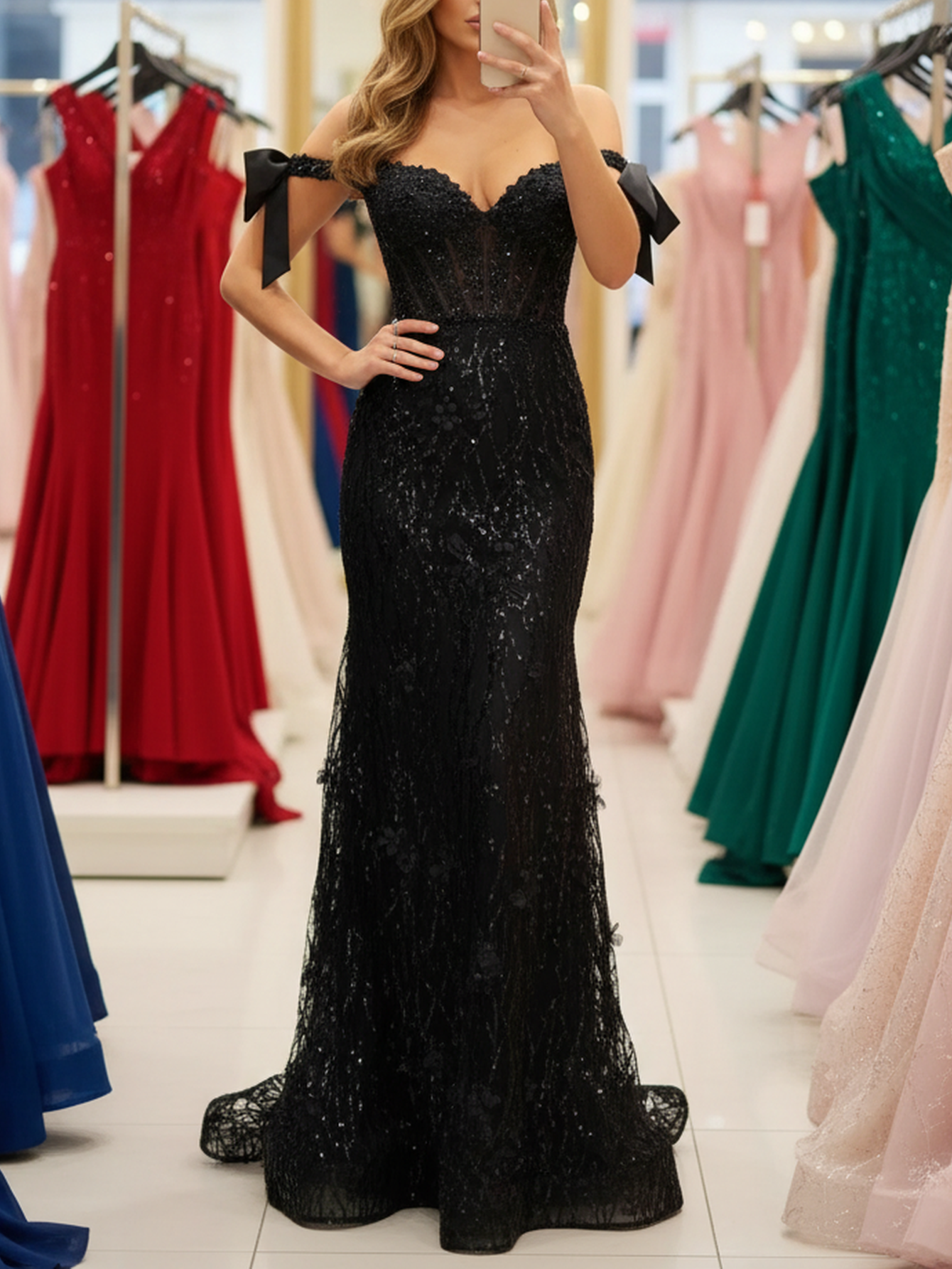 Sparkly Bow Lace Up Off Shoulder Illusion Bodice Long Mermaid Prom Dress - Black