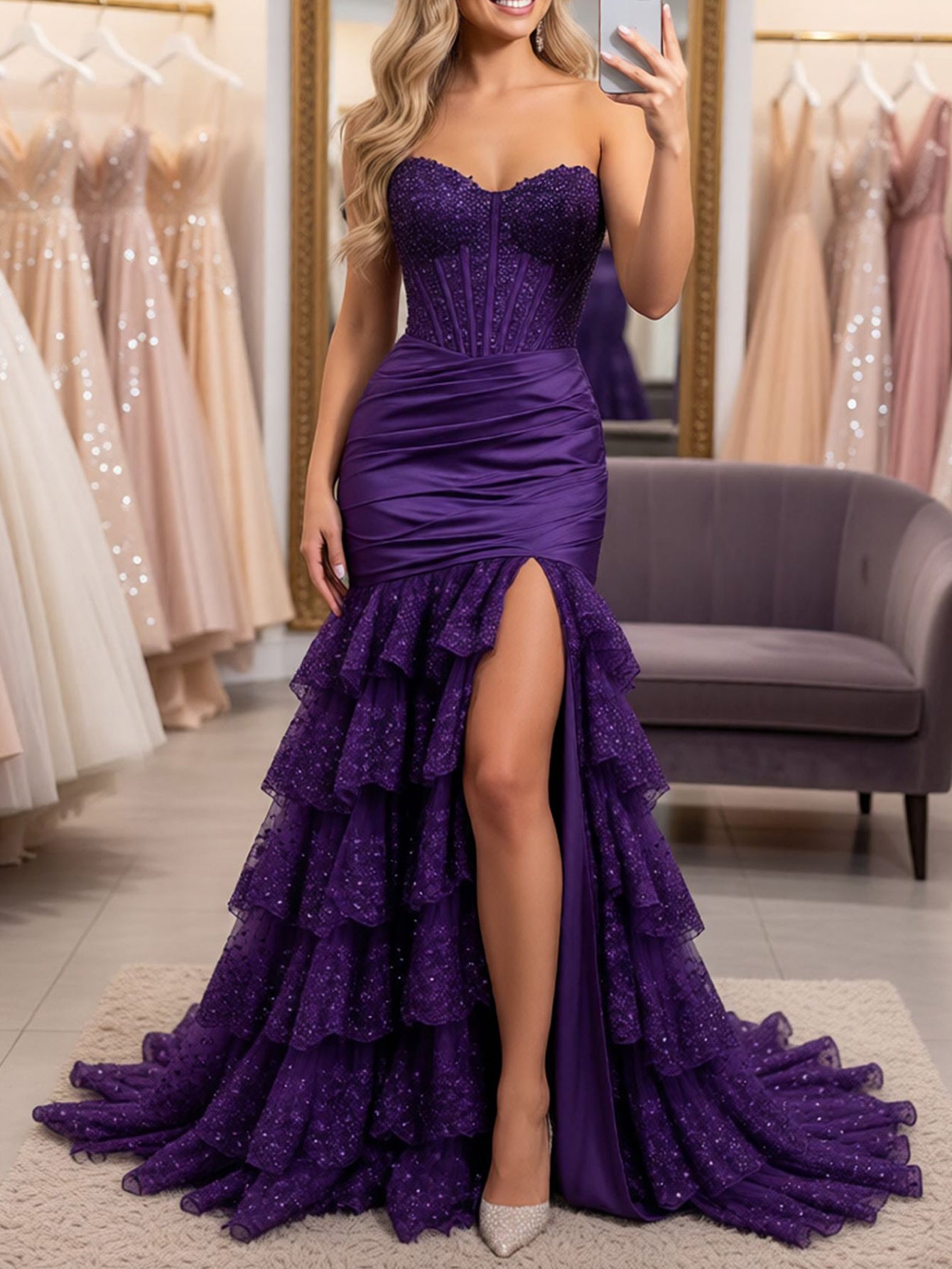 Sparkly Lace Boned Mermaid Prom Dress With Ruffle - Purple