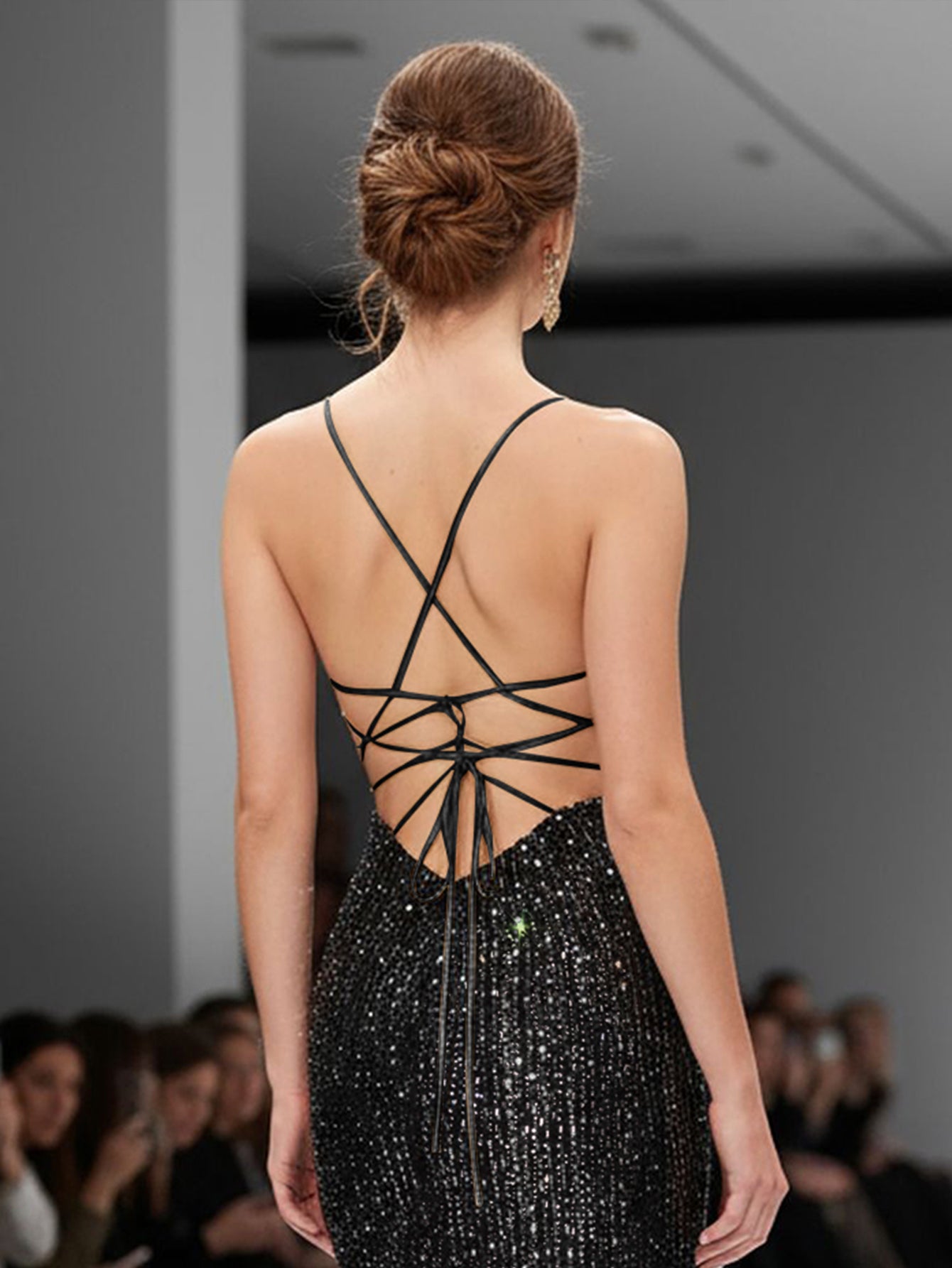 Details: Backless, Sparkly, Split, Ruched, Lace Up