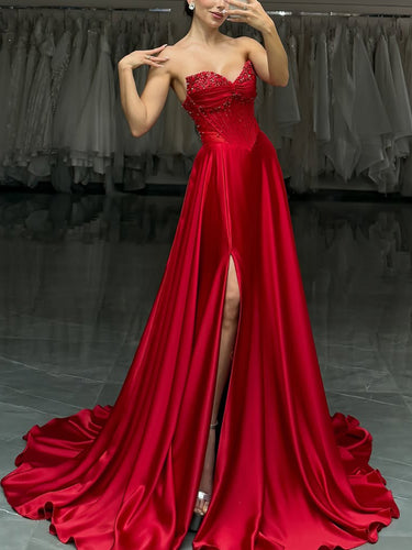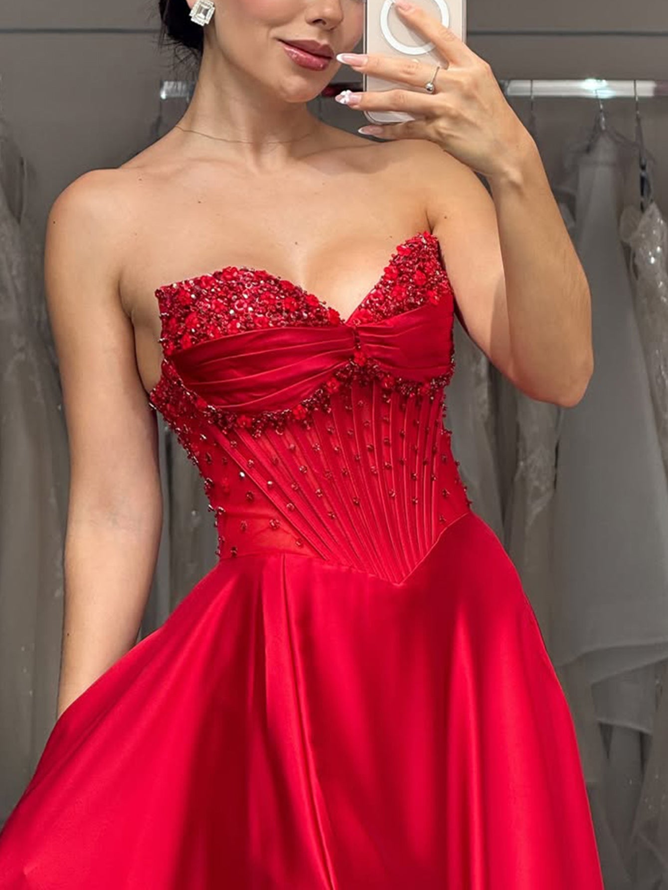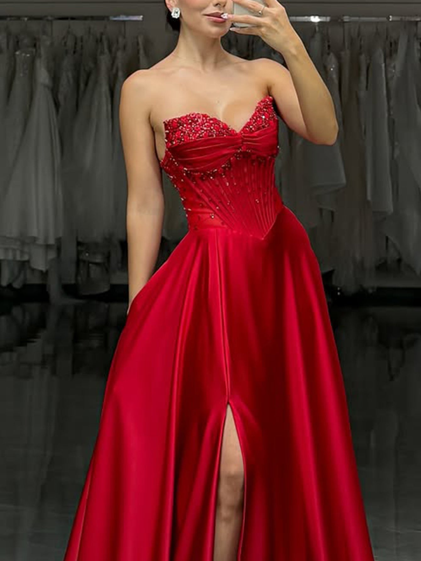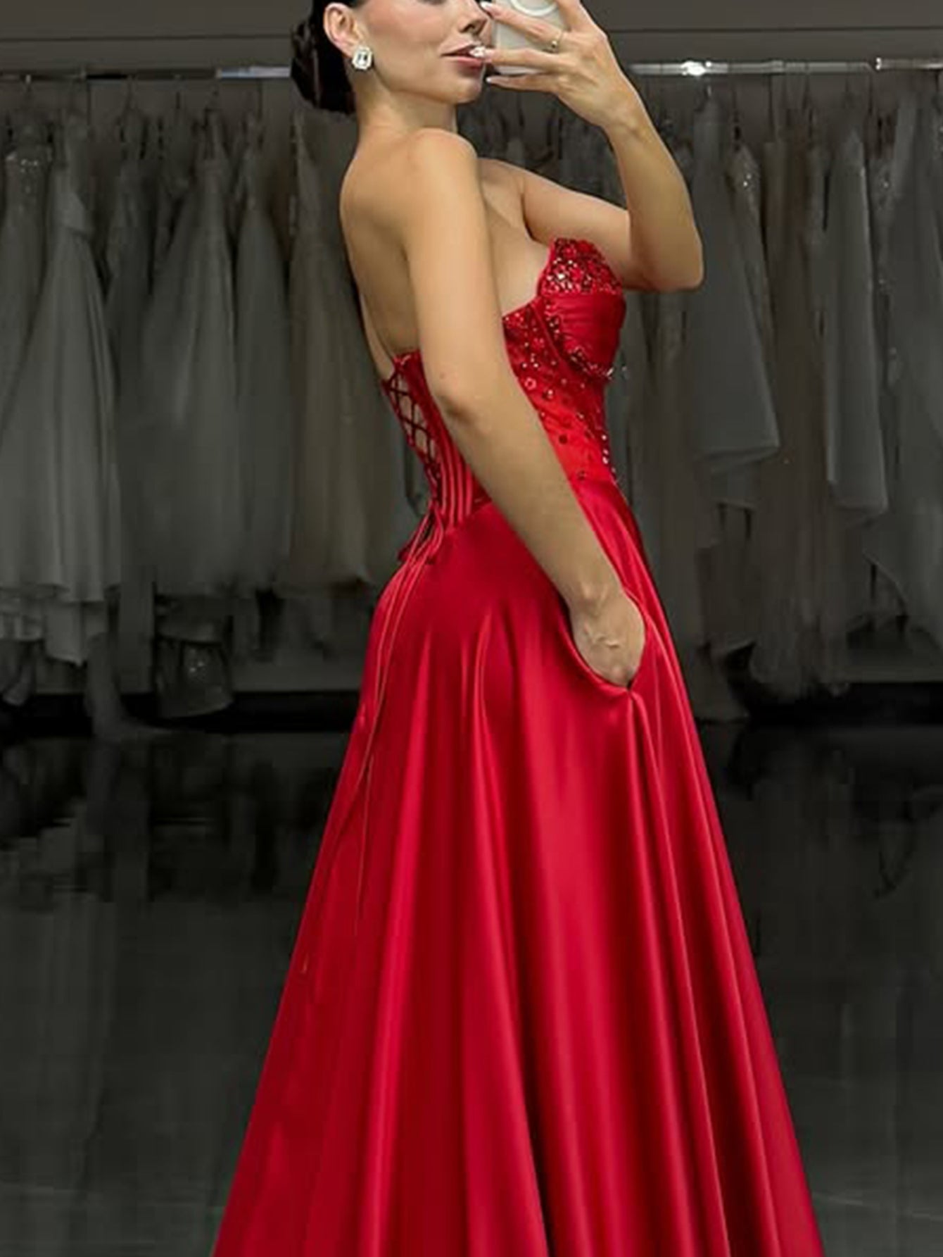 This satin prom gown features crystal beading sheer on the illusion bodice. The strapless dress has a sweetheart neckline and pleated hem. Worldprom mermaid prom dresses are ideal for party, evening or festivals.