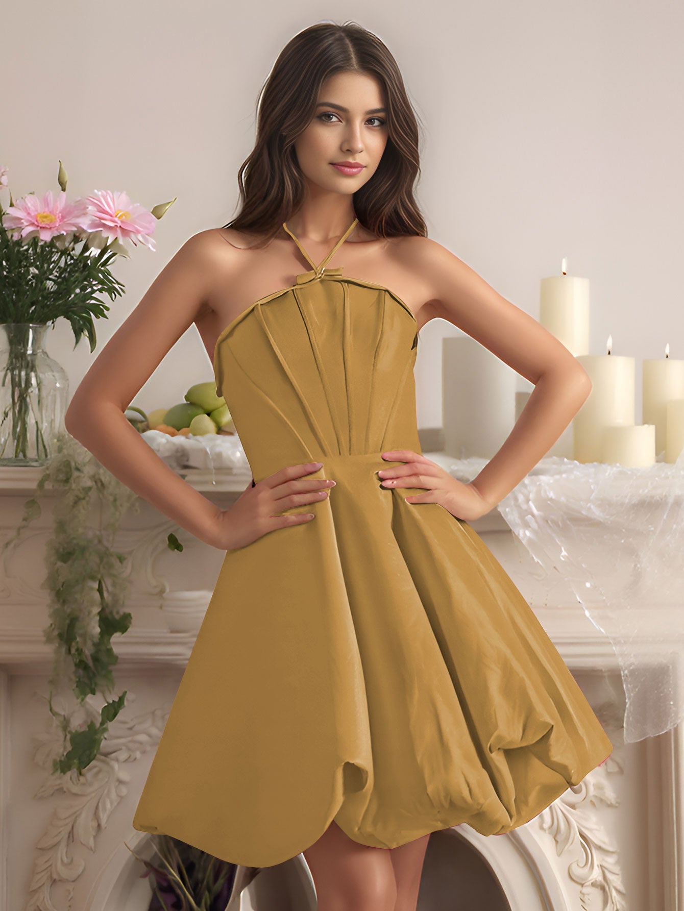 Puffy Boned Halter Bows Mini Ball Gown Prom Dress - Gold