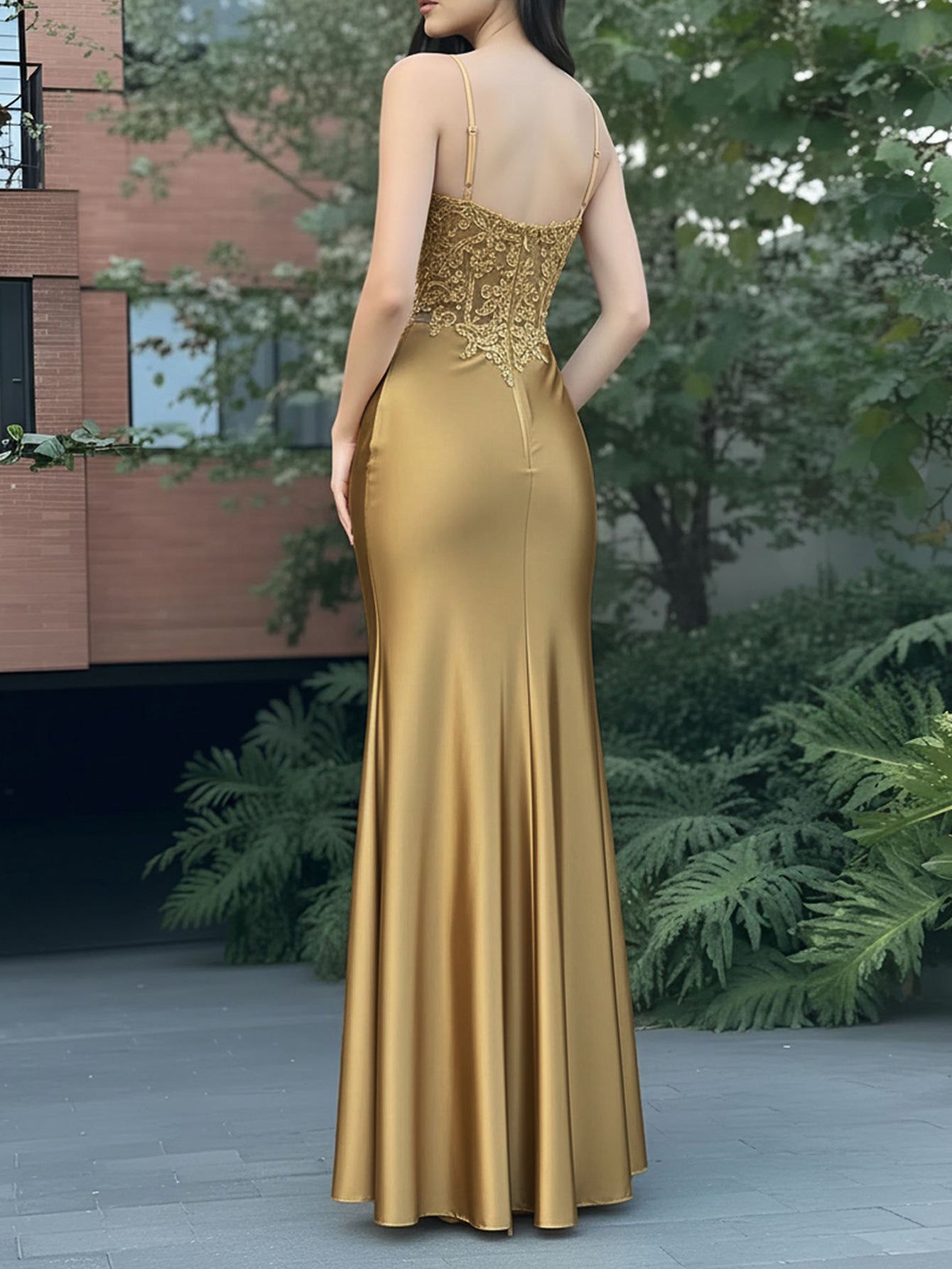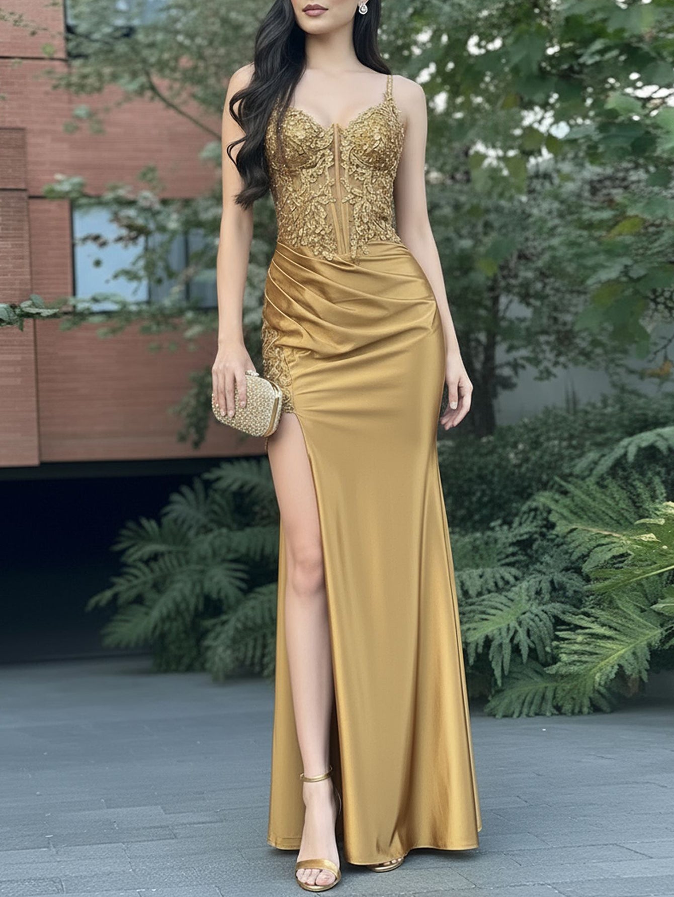 Bodice Split Sparkly Lace Mermaid Long Prom Dress - Gold