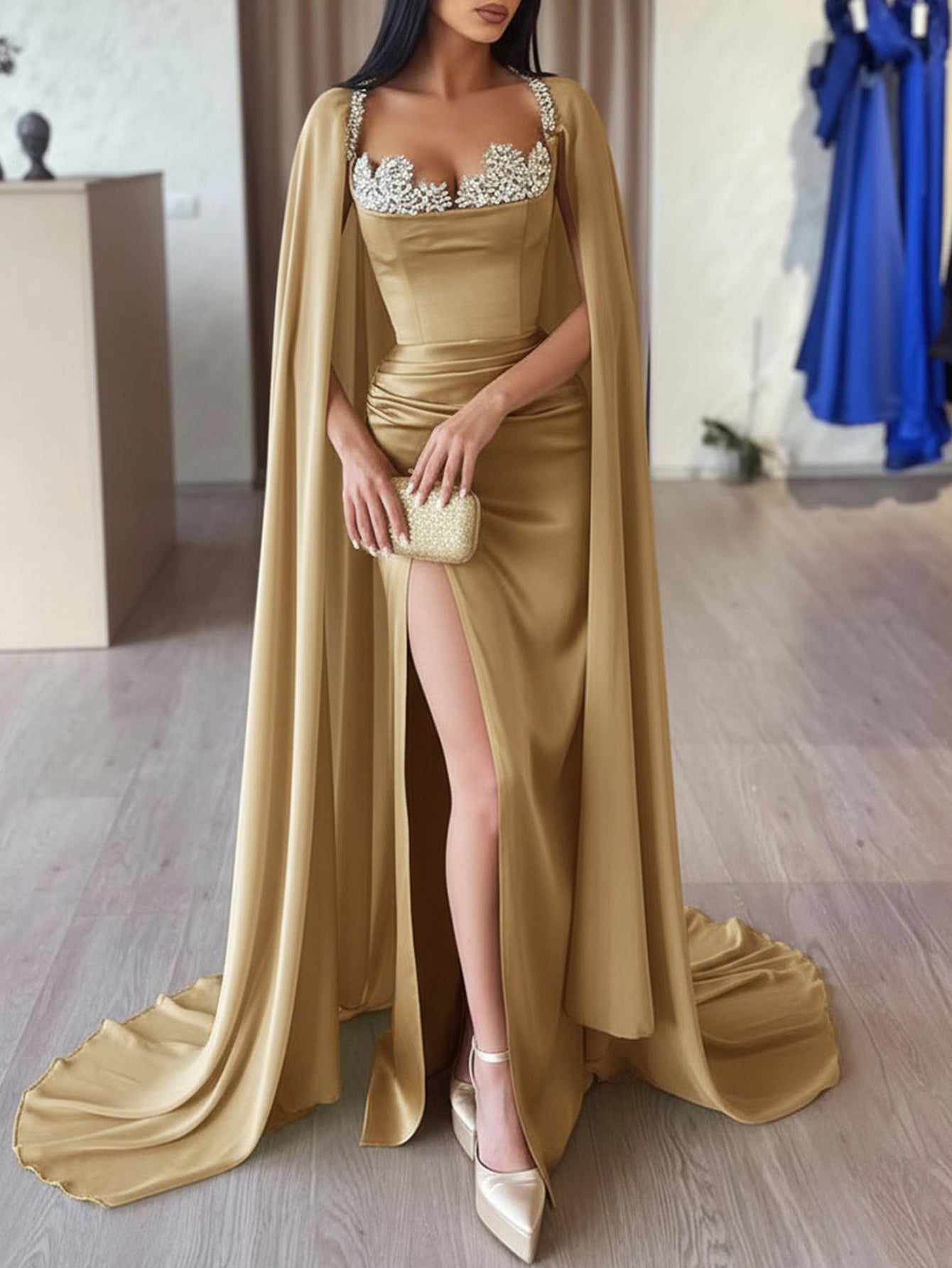 Crystal Sheath Long Prom Dress With Shawl - Gold