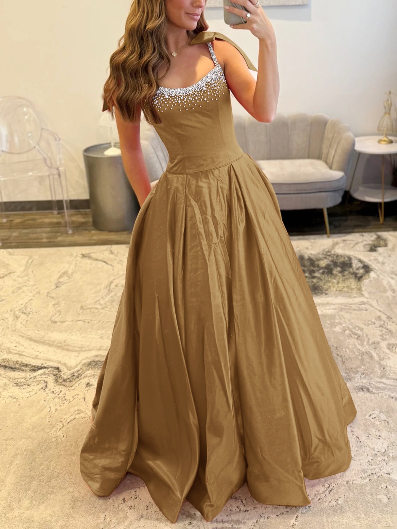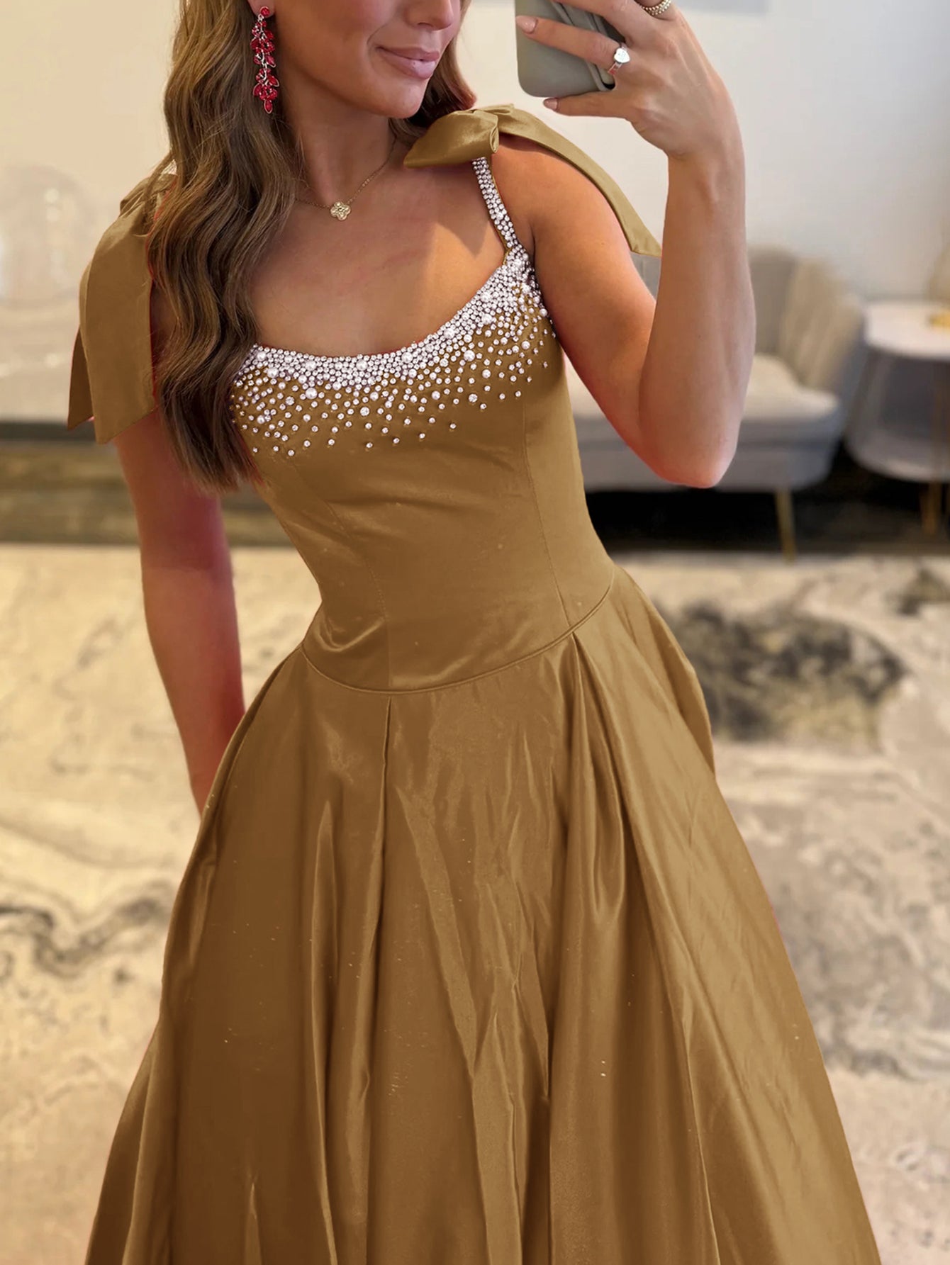 This satin prom gown features hand-beading with bows on the bodice. The long evening dress has a scoop neckline and ball gown hem. This formal dress is ideal for party, evening or festivals.