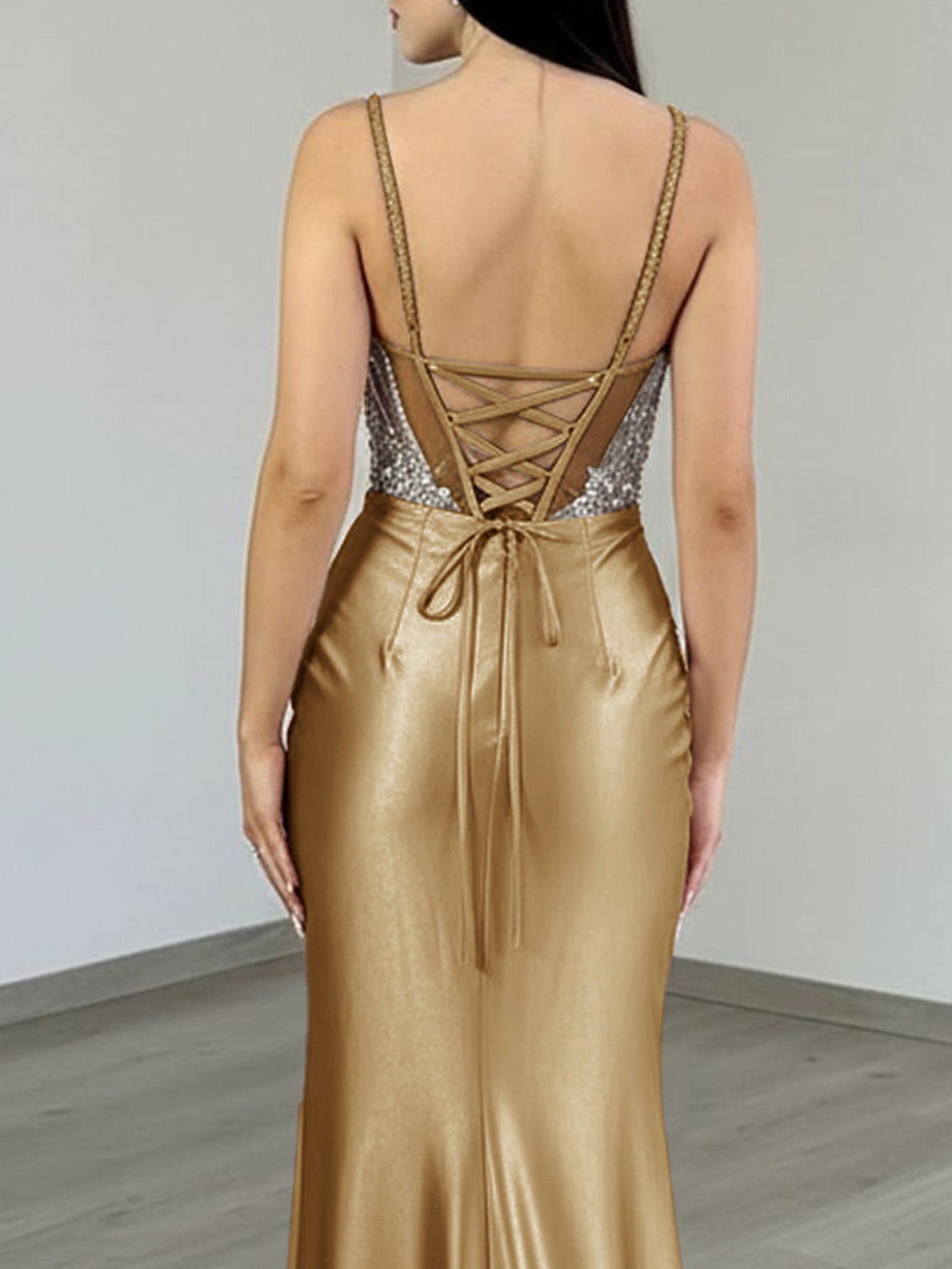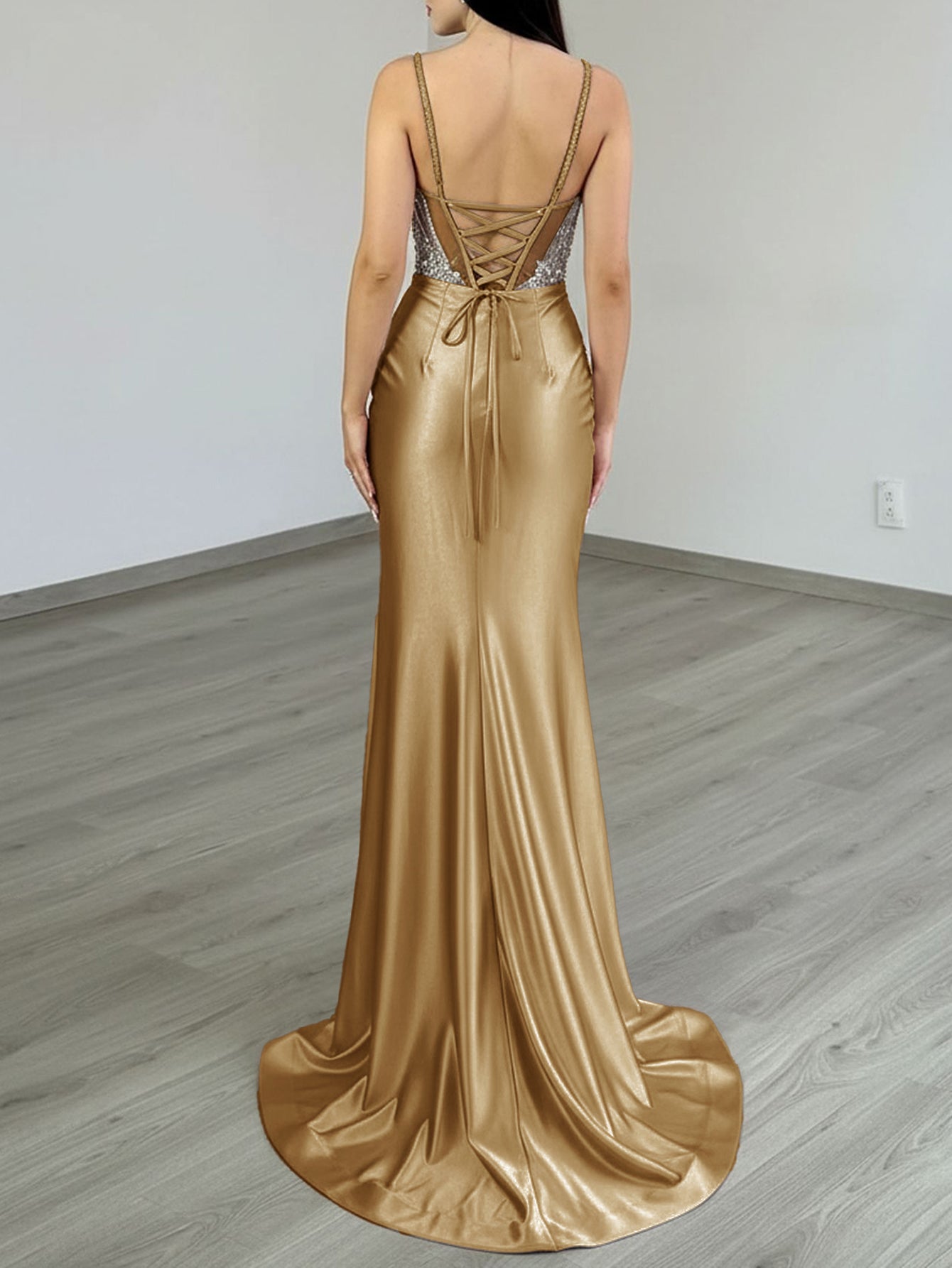 This stretch satin evening dress features ruched waist with crystals on the illusion bodice. The strapless boned maxi dress has a V-neck and split hem. Luxury mermaid dresses are ideal for party, evening or festivals.