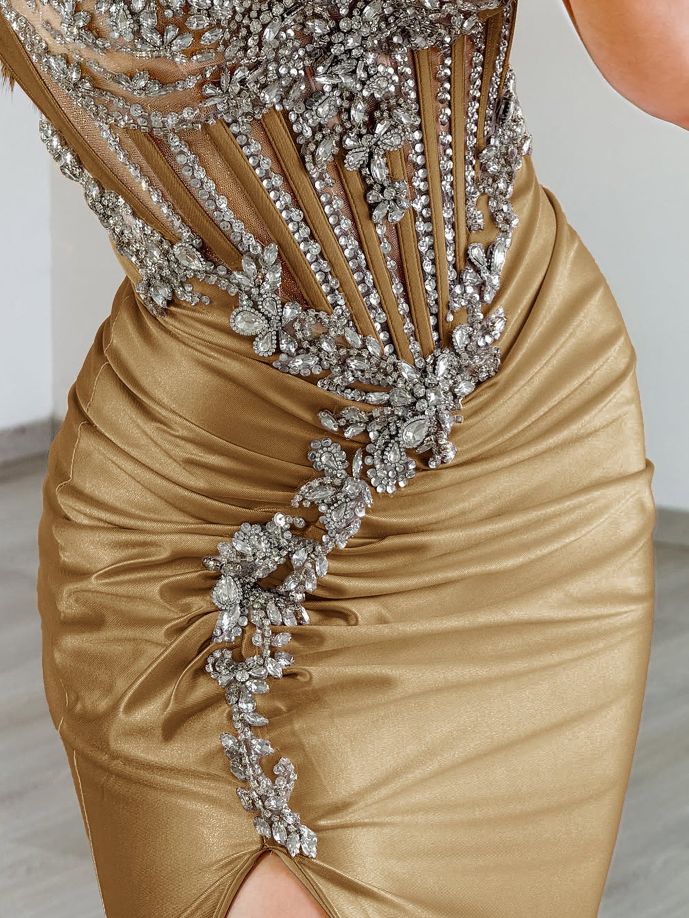 Luxury Crystal Illusion Mermaid Long Prom Dress - Gold