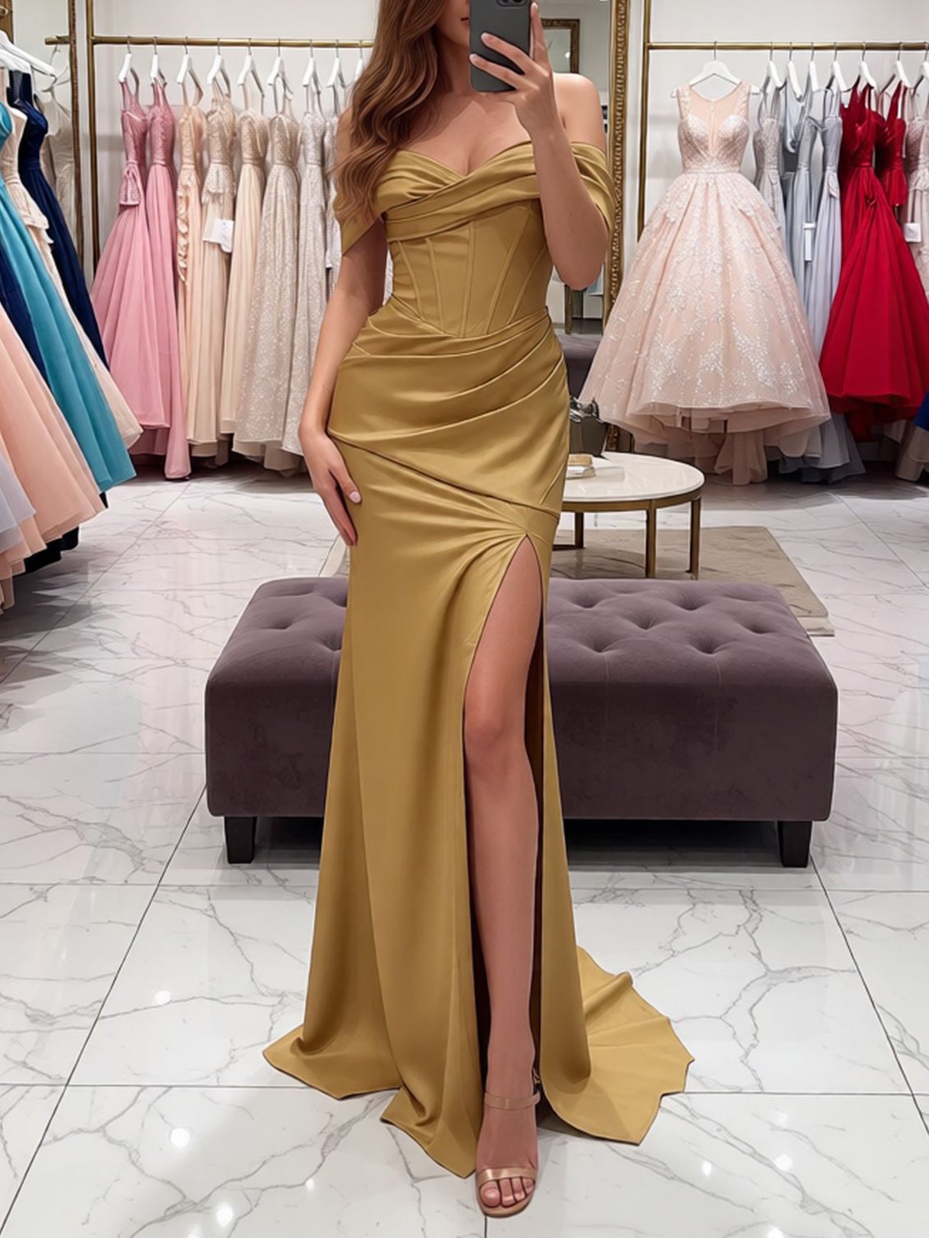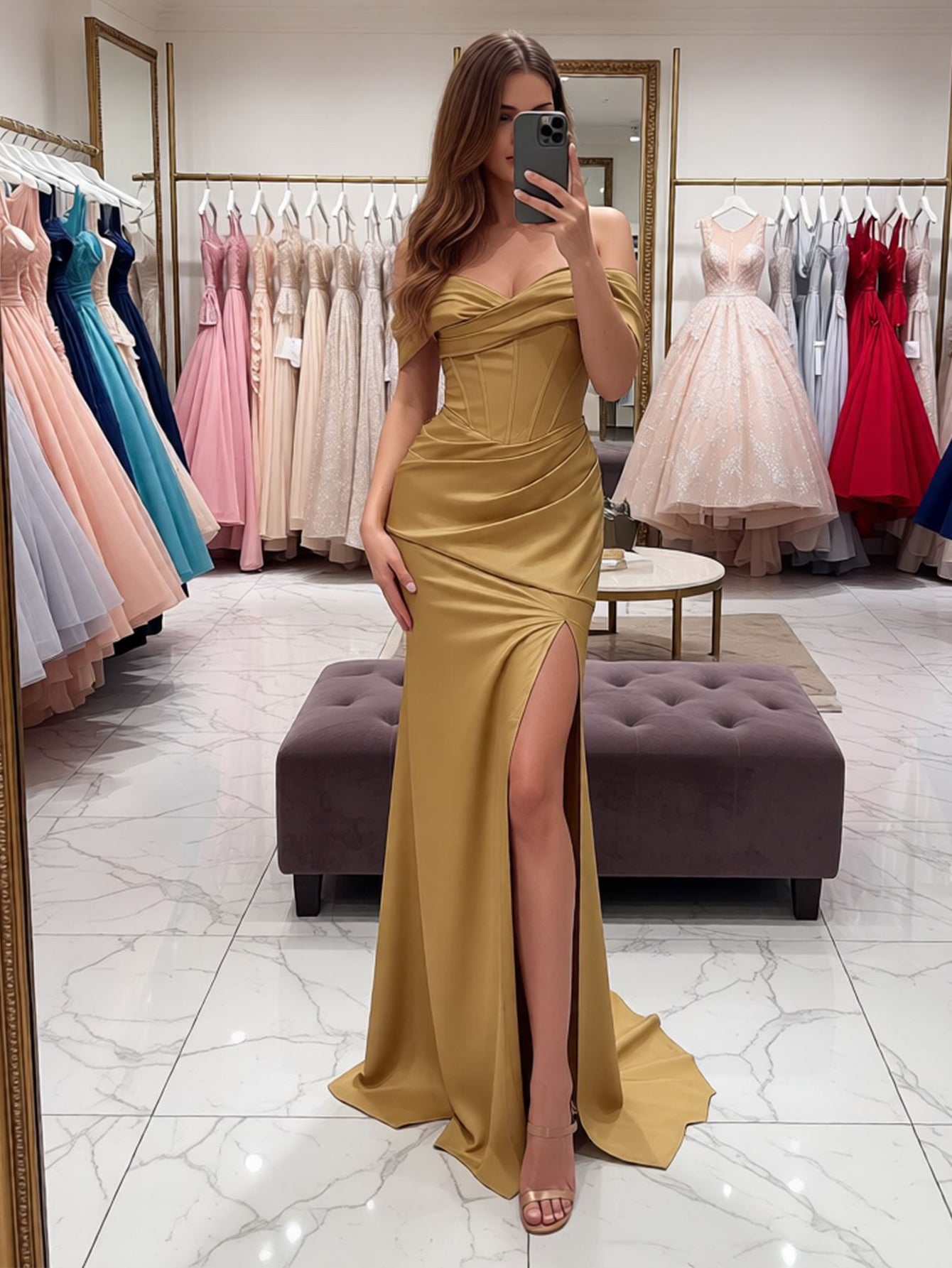 Off Shoulder Mermaid Prom Dress Long With Split - Gold