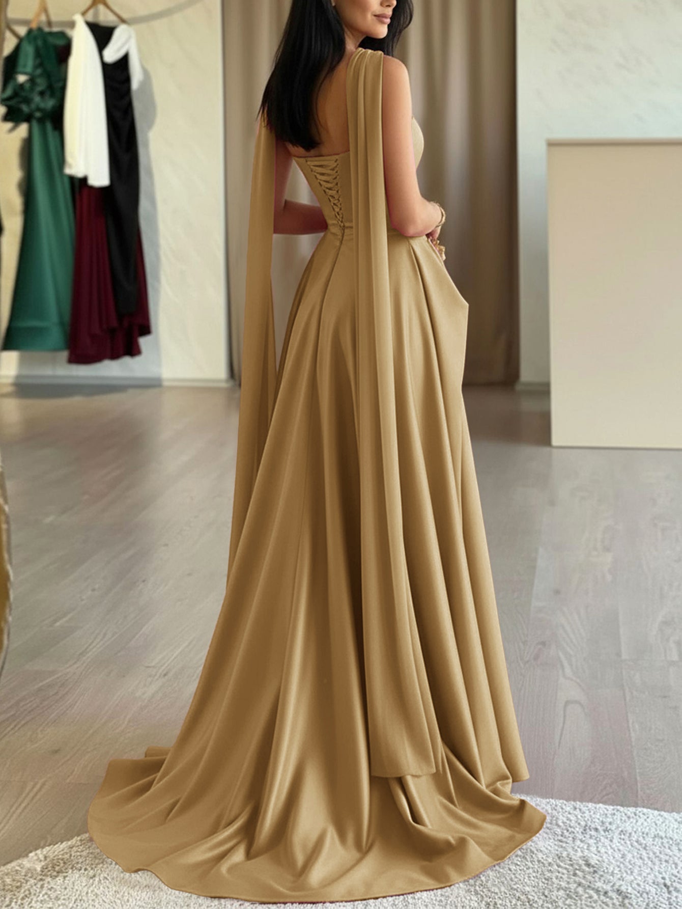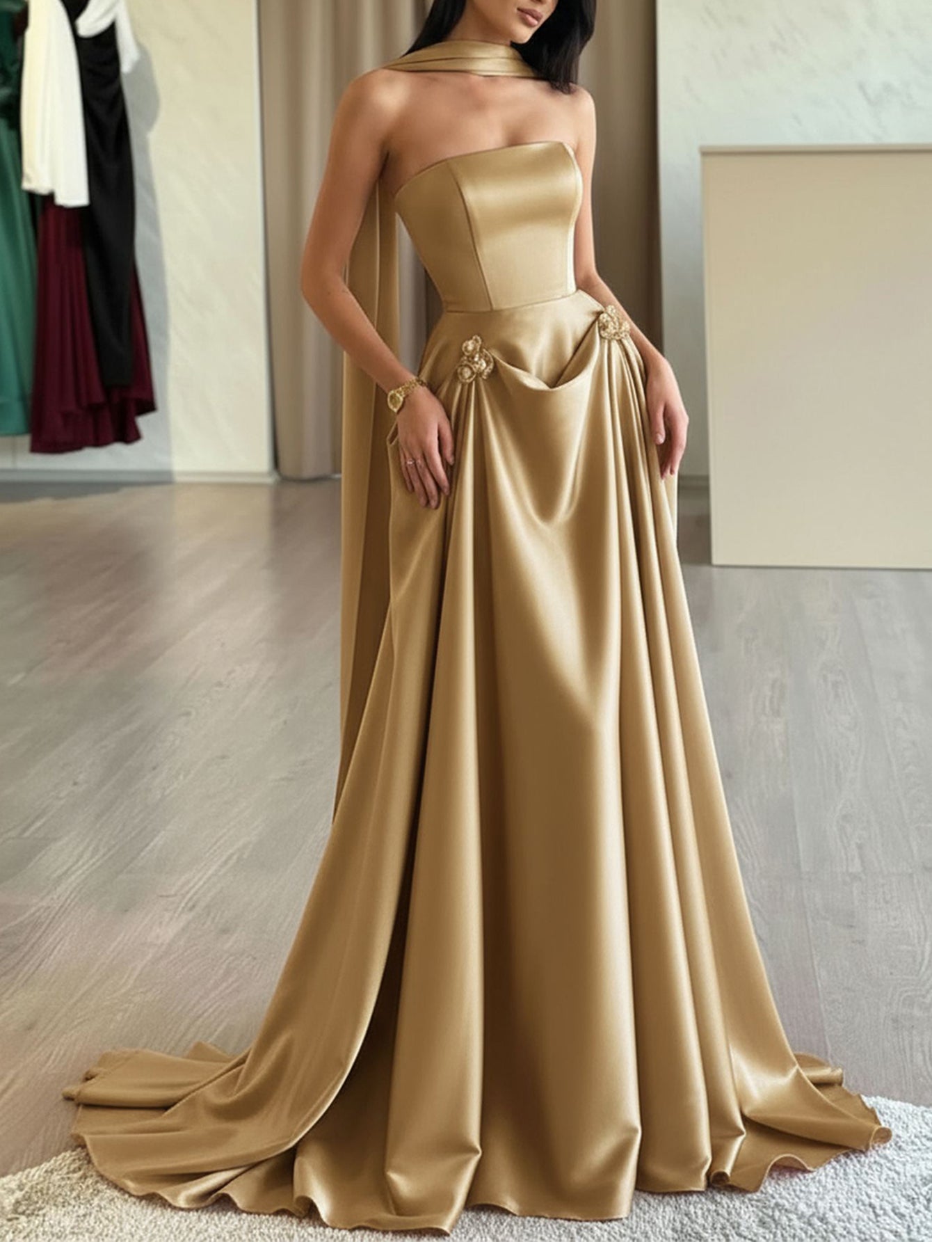 This satin ball gown features sweetheart decoration with shawl on the bodice. The strapless prom dress has a scoop neckline and pleated hem. Elegant formal dresses are ideal for party, evening or festivals.