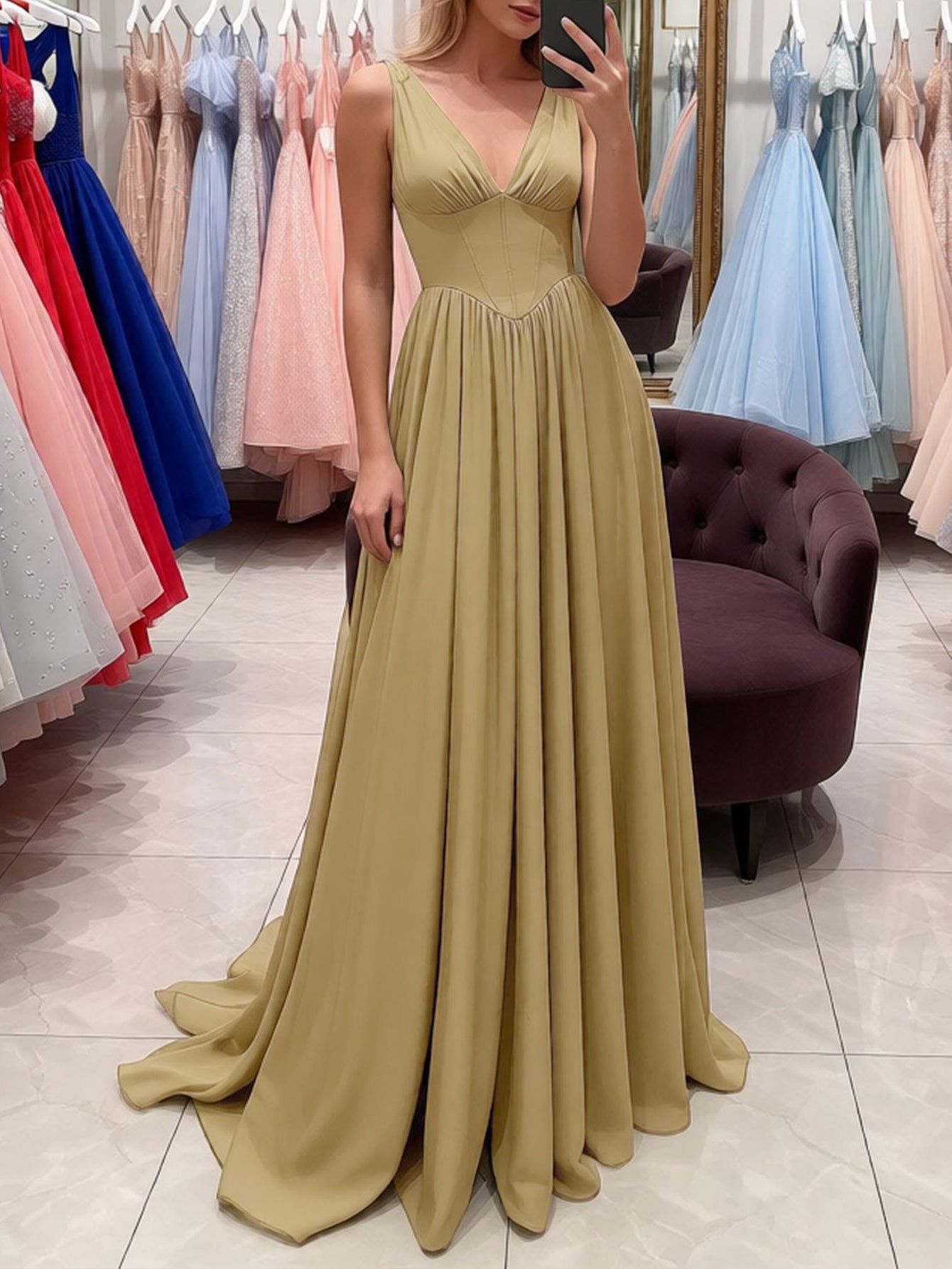 This satin prom gown features boned with crystals on the bodice. The tank top evening dress has a V-neck and pleated hem. This classy ball gown dress is ideal for party, evening or festivals.