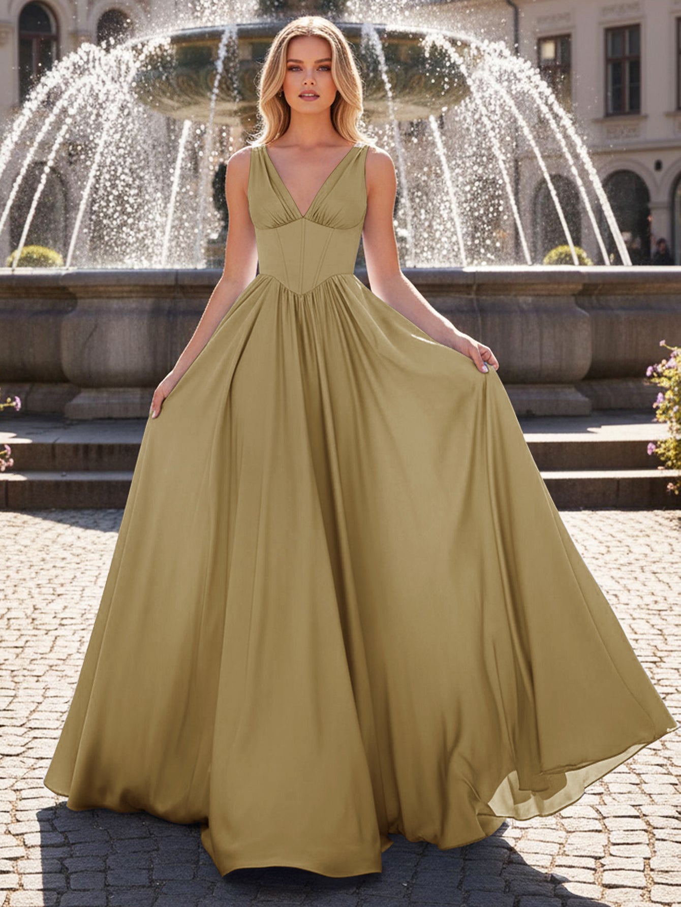 Tank Top Boned V Neck Ball Gown Prom Dress - Gold