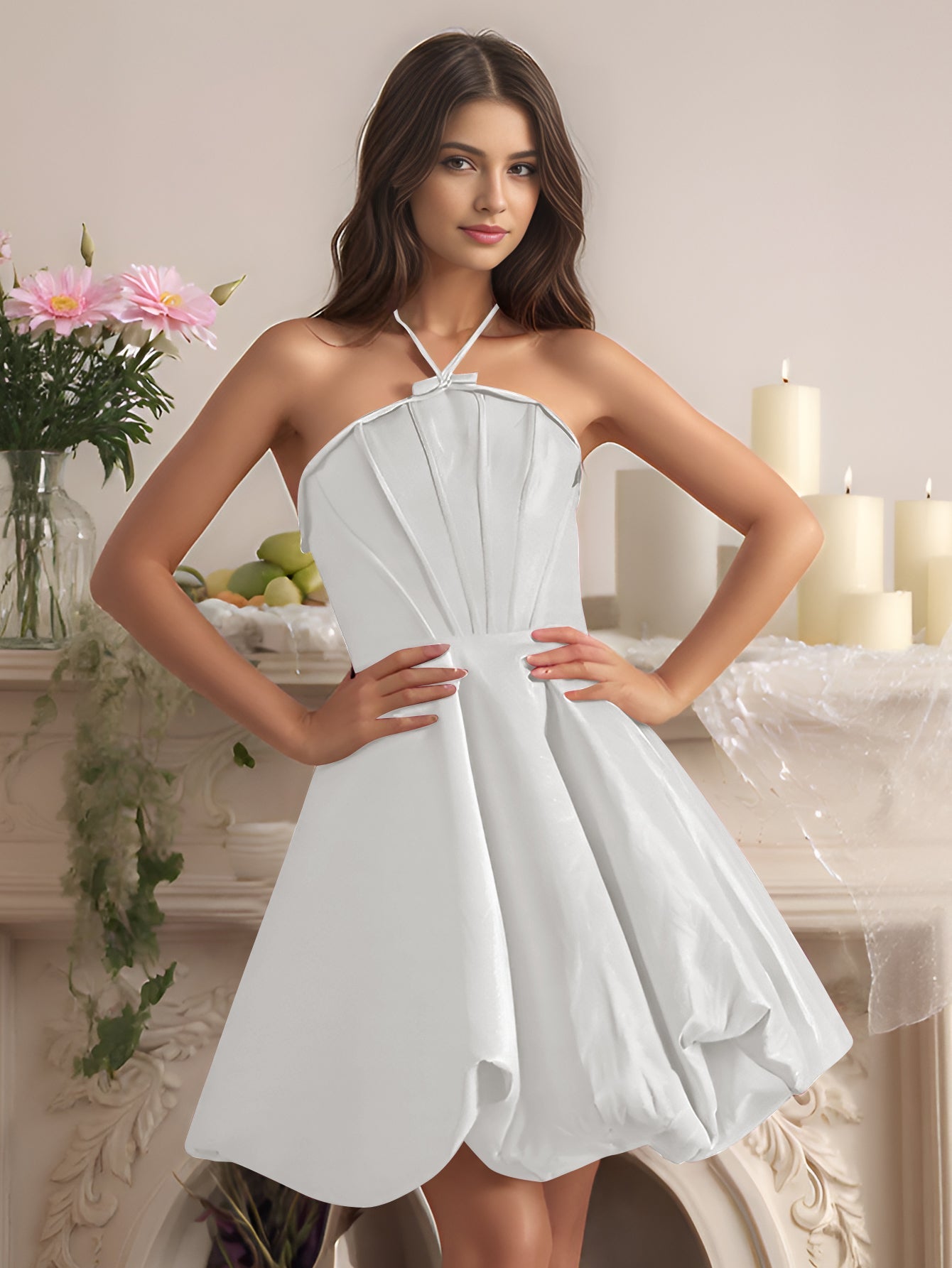 Puffy Boned Halter Bows Mini Ball Gown Prom Dress - White