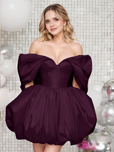Off Shoulder Puffy Bodice Satin Mini Ball Gown Prom Dress - Grape
