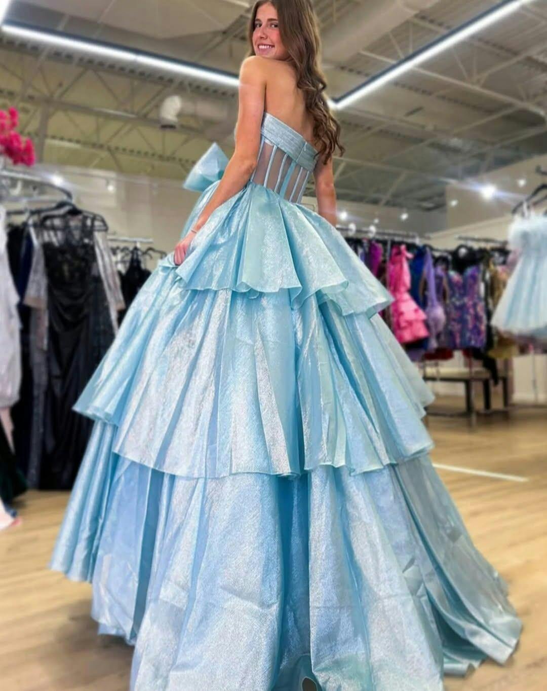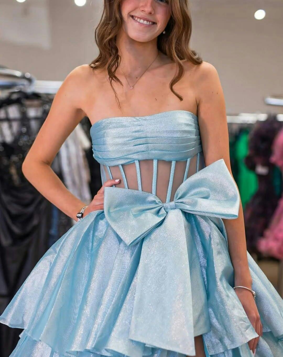 This satin prom dress features hot fix crystal and big bow front on a sheer net bodice. The strapless dress for prom has a ruched bust and layered ruffle hem. This sexy ball gown prom dress is ideal for party, evening, anniversary party, birthday party, cocktail, graduation party or homecoming events.