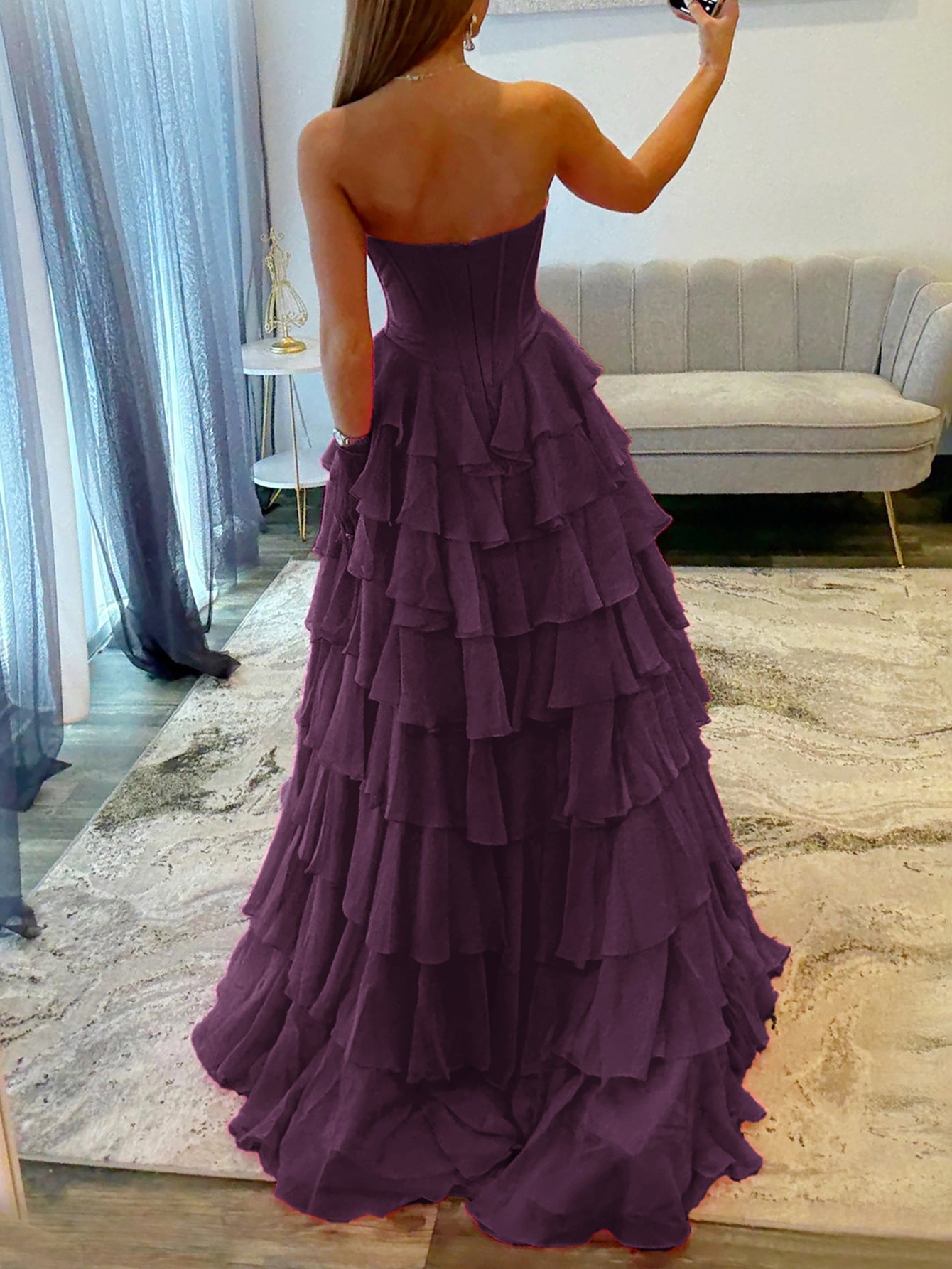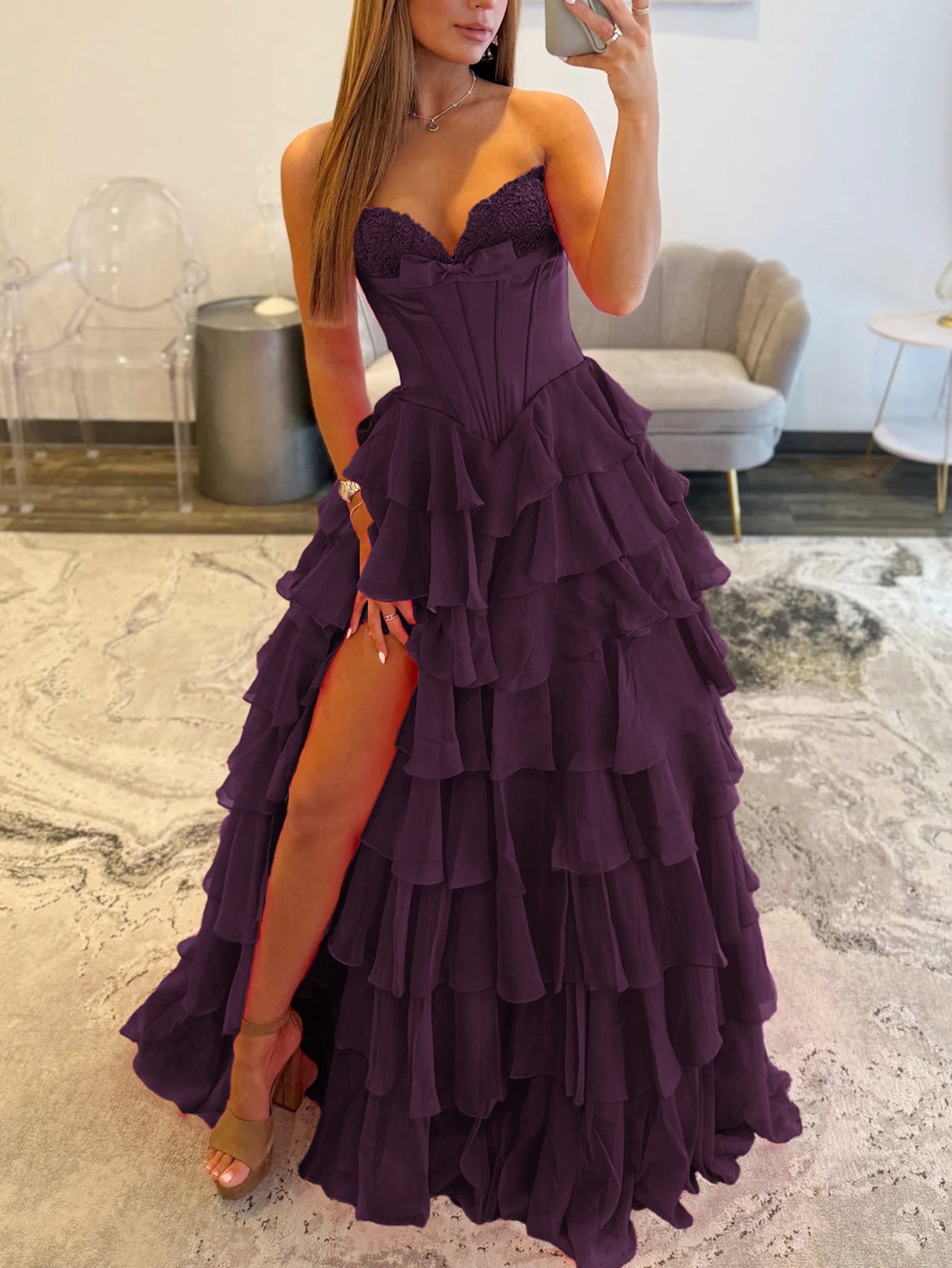 This chiffon prom gown features lace embroidery on the bodice. The strapless maxi dress has a sweetheart neckline and layered hem. This ball gown formal dress is ideal for party, evening or festivals.