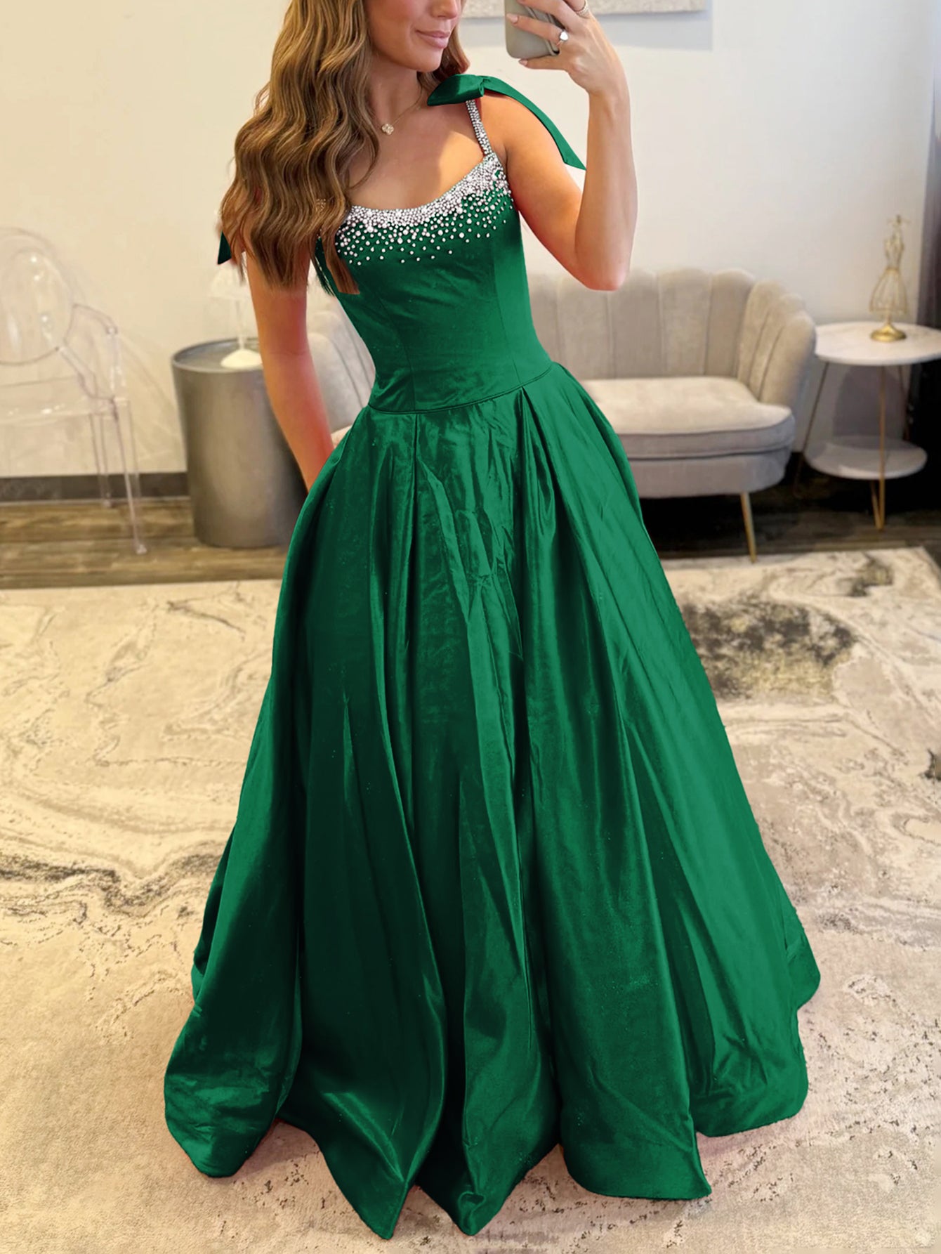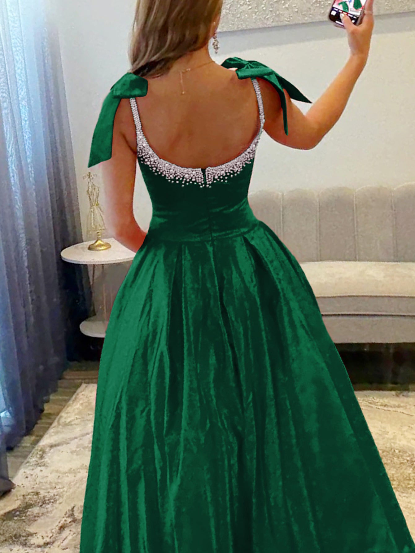 This satin prom gown features hand-beading with bows on the bodice. The long evening dress has a scoop neckline and ball gown hem. This formal dress is ideal for party, evening or festivals.