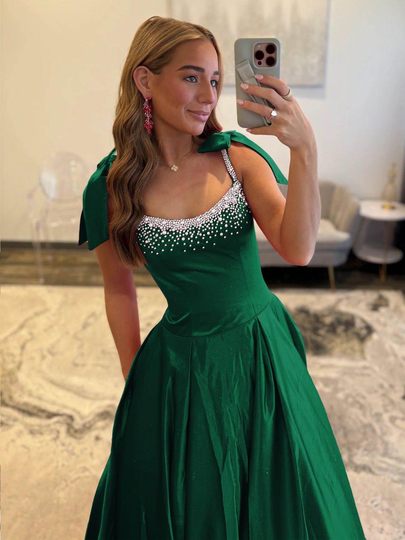 Hand Beading Bodice Ball Gown Prom Dress With Bows - Emerald Green